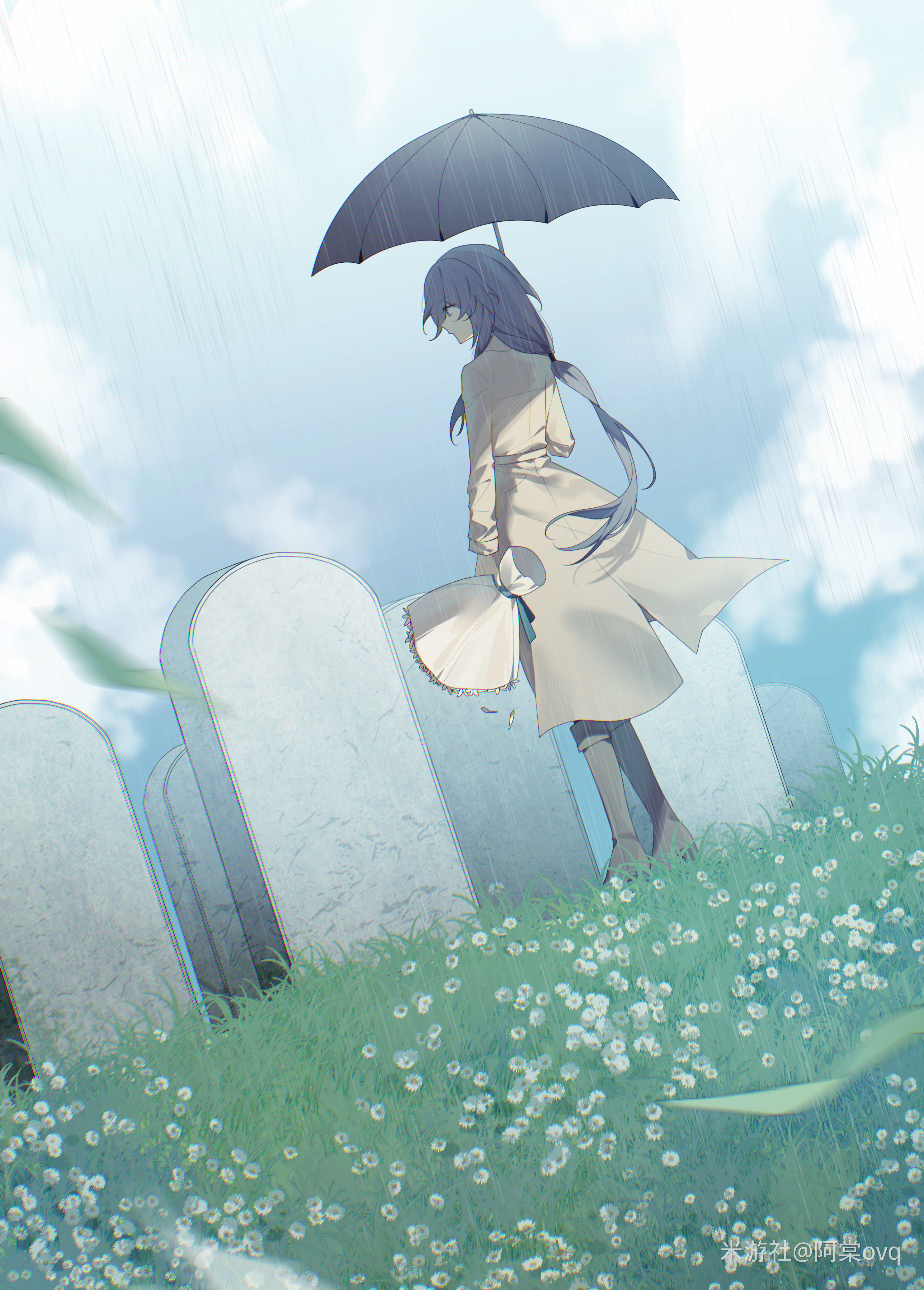 1girl absurdres ankle_boots artist_name blue_background blue_eyes blue_hair blue_sky boots bouquet brown_boots brown_coat chinese_text closed_mouth cloud cloudy_sky coat commentary flower fu_hua full_body grass graveyard grey_hair hair_between_eyes highres holding holding_bouquet holding_umbrella honkai_(series) honkai_impact_3rd long_hair long_sleeves low-tied_long_hair low_ponytail official_alternate_costume ponytail rain saya_atang simplified_chinese_text sky solo standing tombstone trench_coat umbrella very_long_hair white_flower