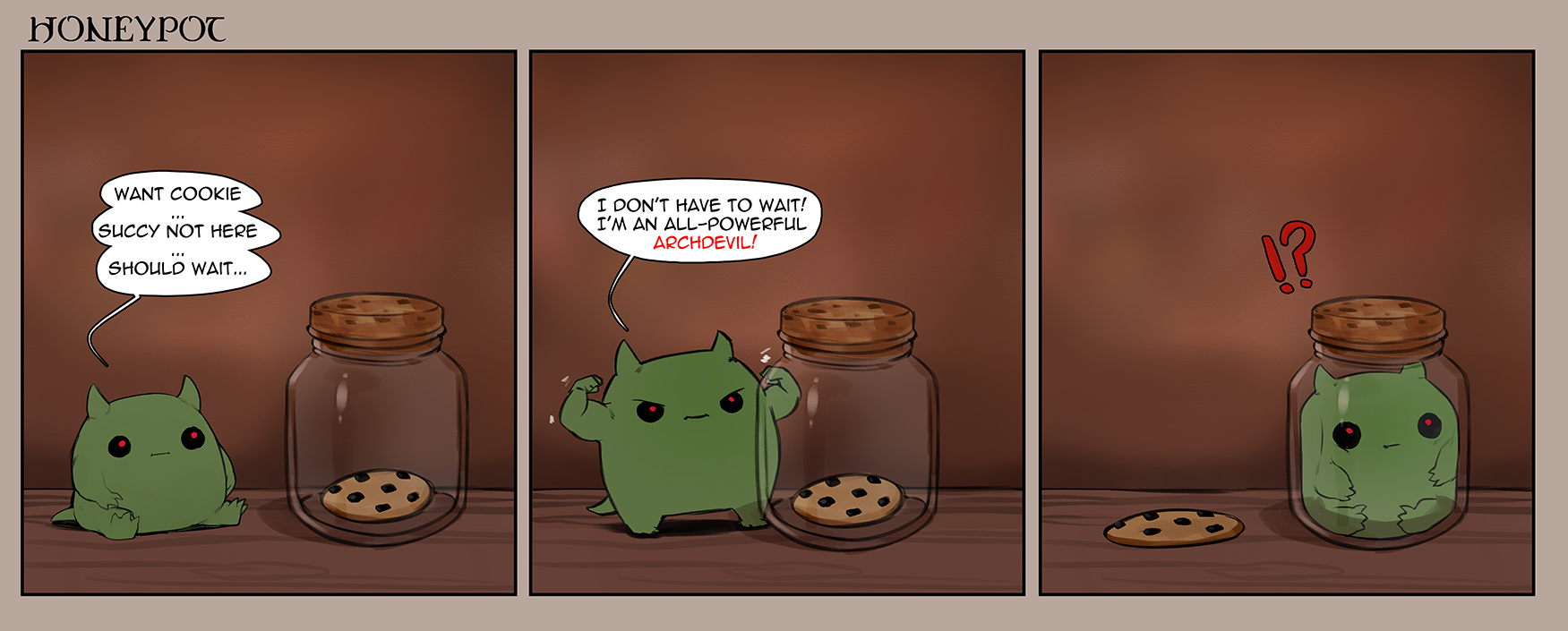 !? arms_up black_sclera blurry blurry_background border brown_background brown_border cherry-gig colored_sclera colored_skin cookie demon english_text food green_skin highres original red_eyes speech_bubble standing strong