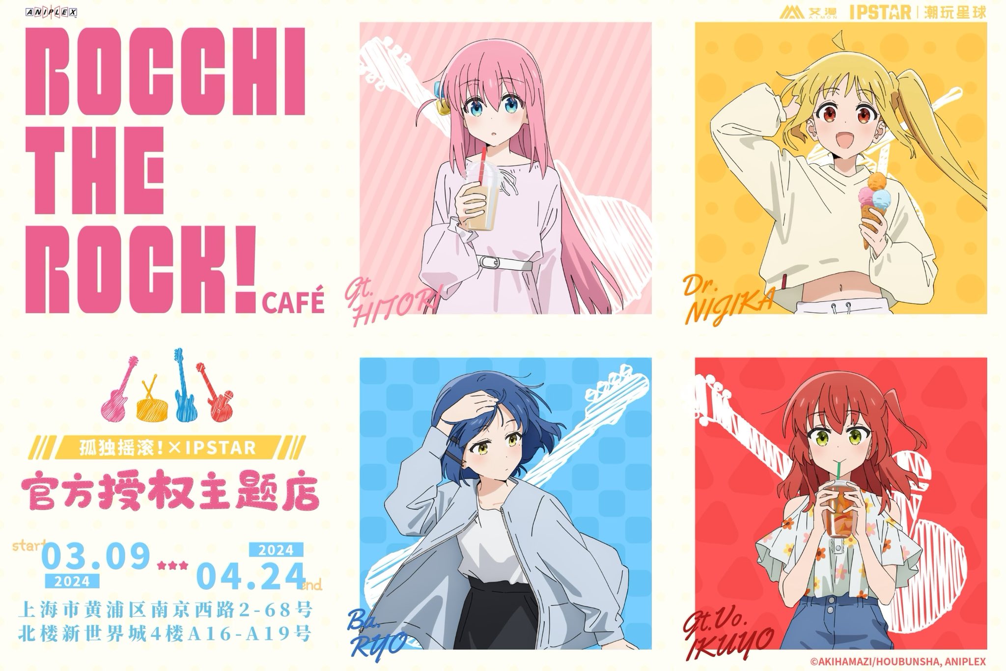 4girls ahoge belt blonde_hair blue_hair bocchi_the_rock! cube_hair_ornament cup drinking_straw gotoh_hitori hair_ornament hairclip highres holding holding_cup ijichi_nijika jacket kita_ikuyo mole mole_under_eye multiple_girls navel official_art one_side_up open_clothes open_jacket pink_hair red_hair side_ponytail smile sweater tomato_(lsj44867) white_belt yamada_ryo