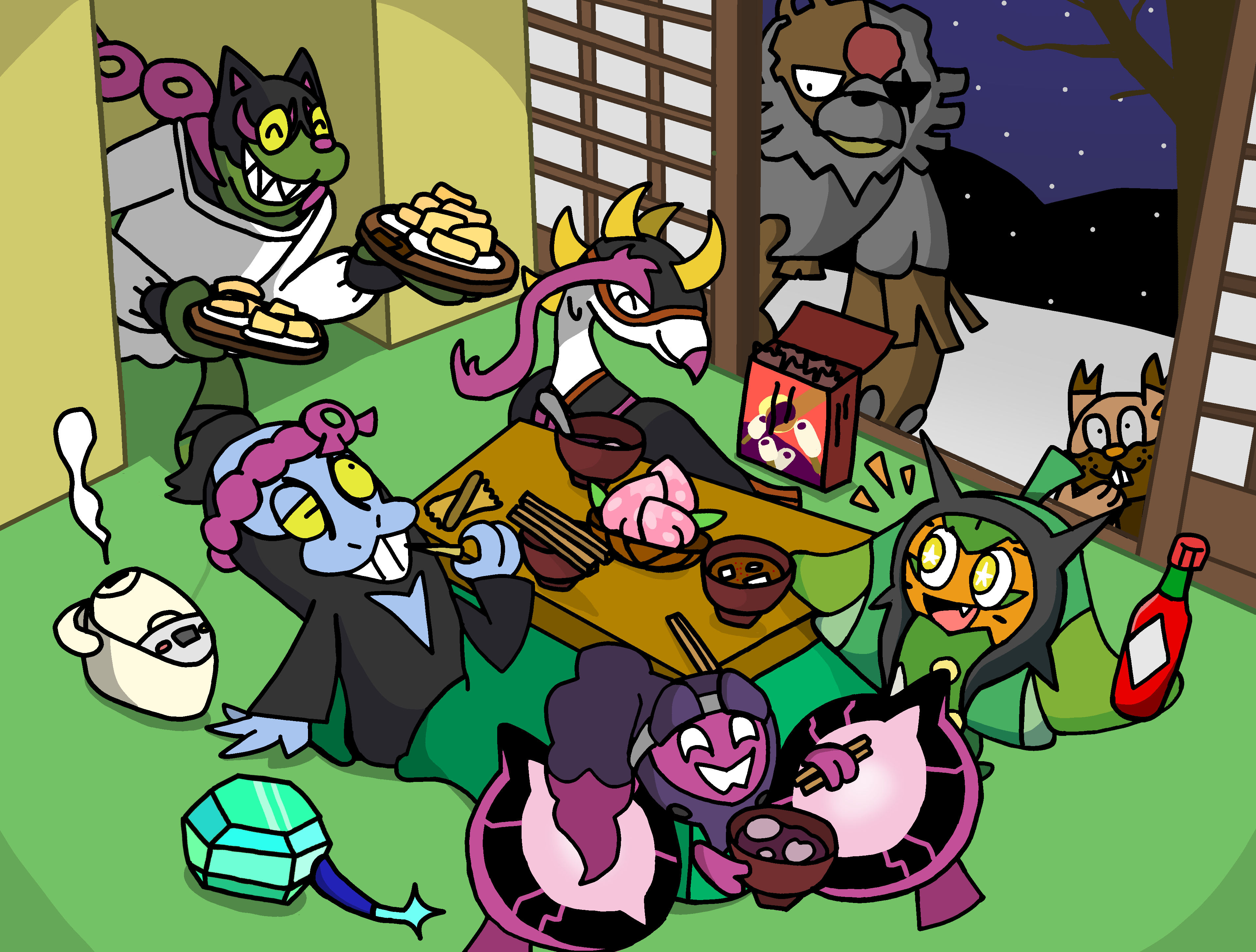 1girl 3boys 3others 4others :3 absurdres animal_ears animal_focus artist_request bird bloodmoon_ursaluna box colored_sclera dog_ears eating expressionless fang fezandipiti food gen_2_pokemon gen_8_pokemon gen_9_pokemon greedent grin happy highres holding holding_food legendary_pokemon looking_at_another multiple_boys multiple_others munkidori night nintendo no_humans ogerpon okidogi pecharunt pokemon pokemon_(creature) sharp_teeth simple_background sitting sky smile source_request standing teeth terapagos terapagos_(normal) ursaluna wings yellow_sclera