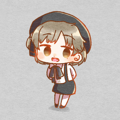 1girl arms_behind_back beret black_hat black_ribbon black_skirt blush brown_eyes brown_hair chibi collared_shirt fangs grey_background hat hat_ribbon hatoba_tsugu leaning_forward long_sleeves lowres mole mole_under_eye neck_ribbon no_sclera open_mouth pantyhose ribbon satome_(min) shirt shoes short_hair simple_background skirt smile solo standing suspender_skirt suspenders tsugu_(vtuber) virtual_youtuber white_pantyhose white_shirt