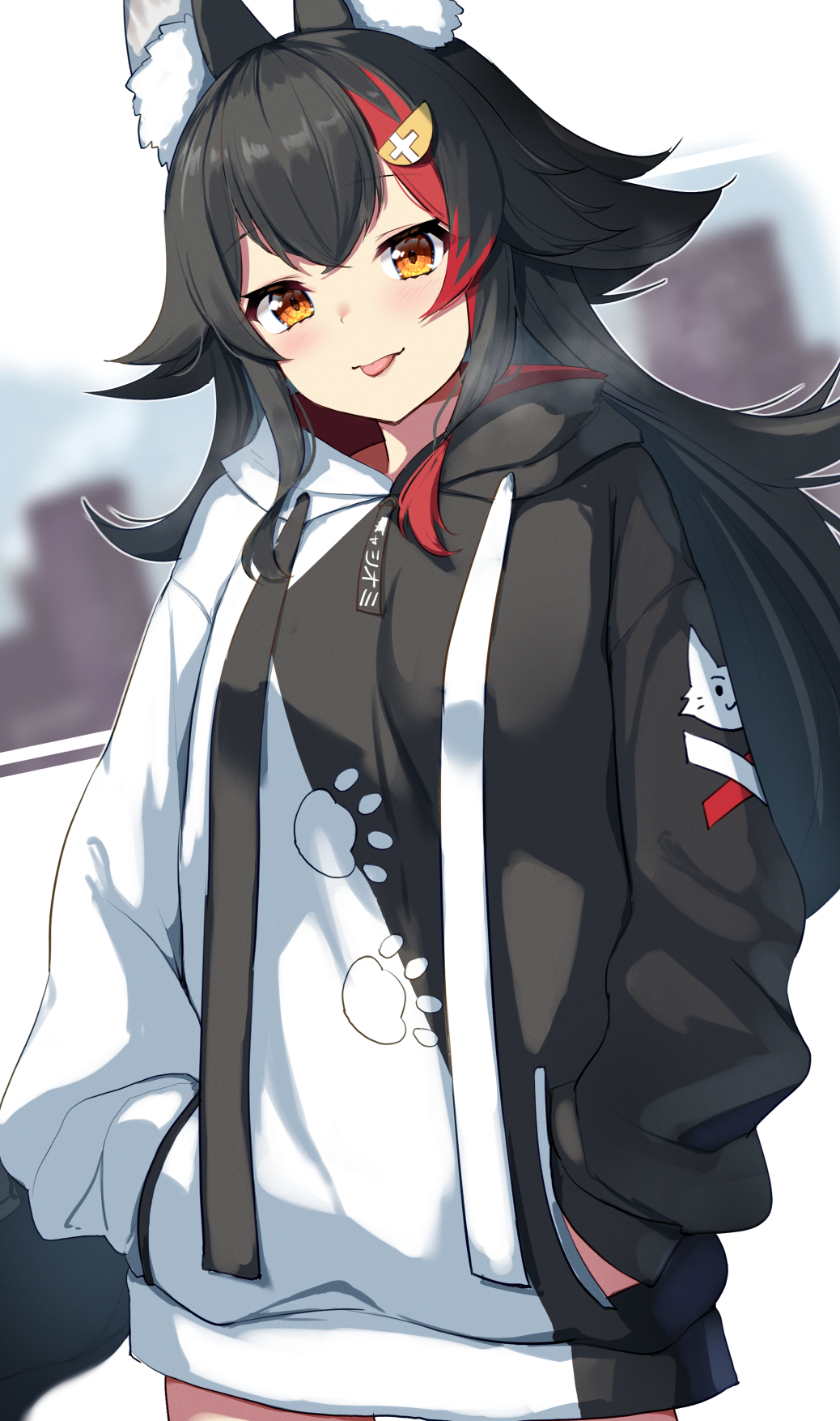 1girl :p animal_ears black_hair black_jacket brown_eyes hair_ornament hands_in_pockets highres hololive jacket long_hair long_sleeves looking_at_viewer multicolored_hair multicolored_jacket ookami_mio ookami_mio_(hoodie) red_hair solo streaked_hair tongue tongue_out two-tone_jacket virtual_youtuber white_jacket wolf_ears wolf_girl yuuzuki_(re'ef)