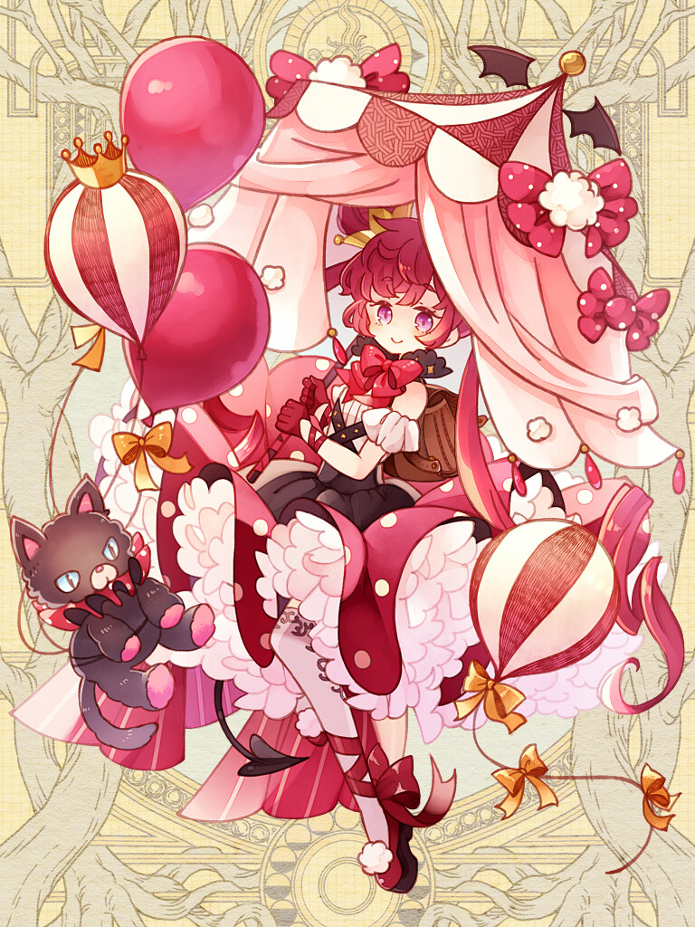 1girl backpack bag balloon bow cat crown dairoku_ryouhei dress full_body gloves holding holding_umbrella looking_at_viewer oboro_kurenai parasol polka_dot polka_dot_dress purple_eyes red_bow red_footwear red_gloves red_hair red_ribbon ribbon smile solo striped_umbrella thighhighs tilted_headwear umbrella virginia_complex yellow_bow