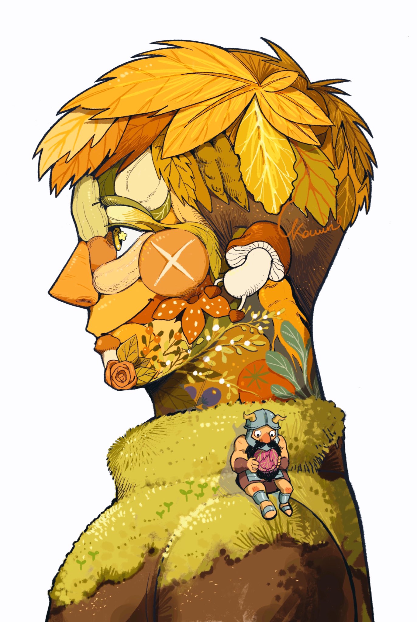 2boys autumn_leaves beard berry black_hair blush carnivorous_plant chili_pepper covered_mouth dungeon_meshi dwarf facial_hair fake_horns fine_art_parody flower golem gourd grass helmet highres holding horned_helmet horns korean_commentary kouwn laios_touden leaf long_beard looking_ahead mandrake mini_person miniboy monsterification moss multiple_boys mustache nose_blush nut_(food) parody red_flower red_rose rose senshi_(dungeon_meshi) short_hair signature simple_background sitting_on_shoulder size_difference solo_focus surreal tomato undercut upper_body walking_mushroom_(dungeon_meshi) white_background yellow_eyes