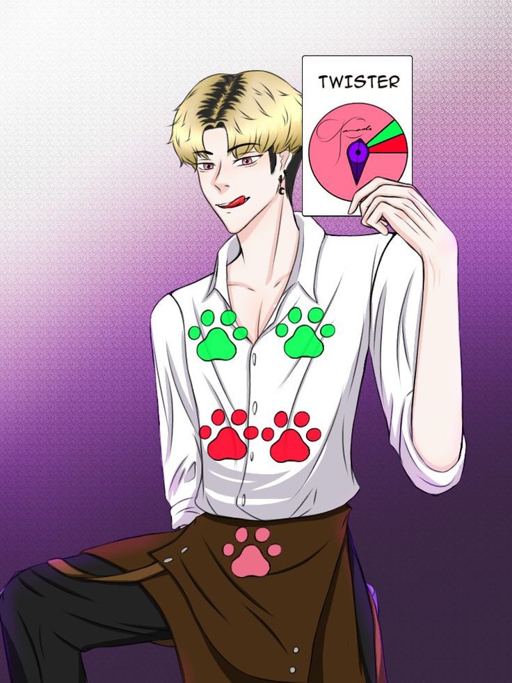 1boy bj_alex black_hair black_pants blonde_hair closed_mouth hand_up long_hair multicolored_hair oh_chanwoo pants paper pink_eyes shirt solo tongue tongue_out two-tone_hair white_shirt