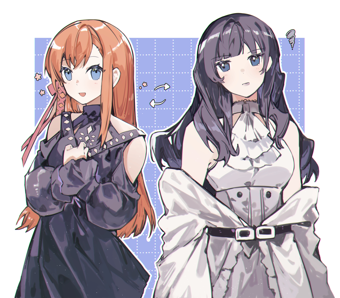 2girls :d ascot black_dress black_hair blue_eyes choker color_switch cowboy_shot dress final_fantasy final_fantasy_xiv frown gaia_(ff14) hair_ribbon light_blush long_hair looking_at_another looking_at_viewer multiple_girls off_shoulder open_mouth orange_hair pink_ribbon ribbon rirene_rn ryne_waters smile white_ascot white_choker white_dress