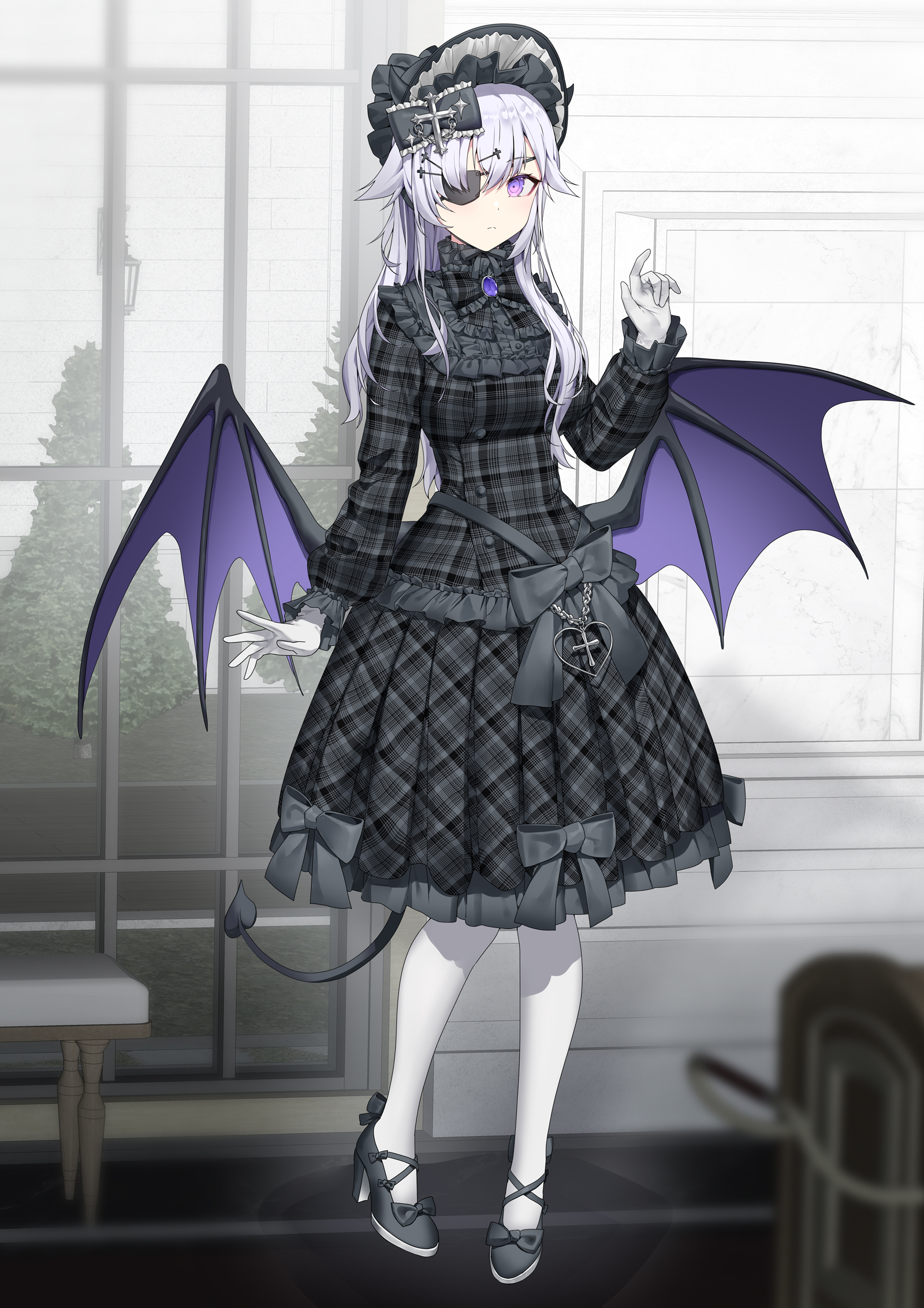 1girl black_headwear black_shoes blurry blurry_foreground bonnet bow breasts brooch closed_mouth commentary_request commission demon_girl demon_horns demon_tail demon_wings depth_of_field eyepatch frilled_skirt frilled_sleeves frills gloves gothic_lolita grey_bow grey_hair grey_shirt grey_skirt hair_between_eyes hand_up high_heels highres horns indoors jewelry lolita_fashion long_hair long_sleeves looking_at_viewer low_wings medium_breasts original pantyhose pixiv_commission plaid_clothes plaid_shirt plaid_skirt pleated_skirt purple_eyes purple_wings ronopu shirt shoes skirt solo standing tail tree very_long_hair wall_lamp white_gloves white_pantyhose window wings