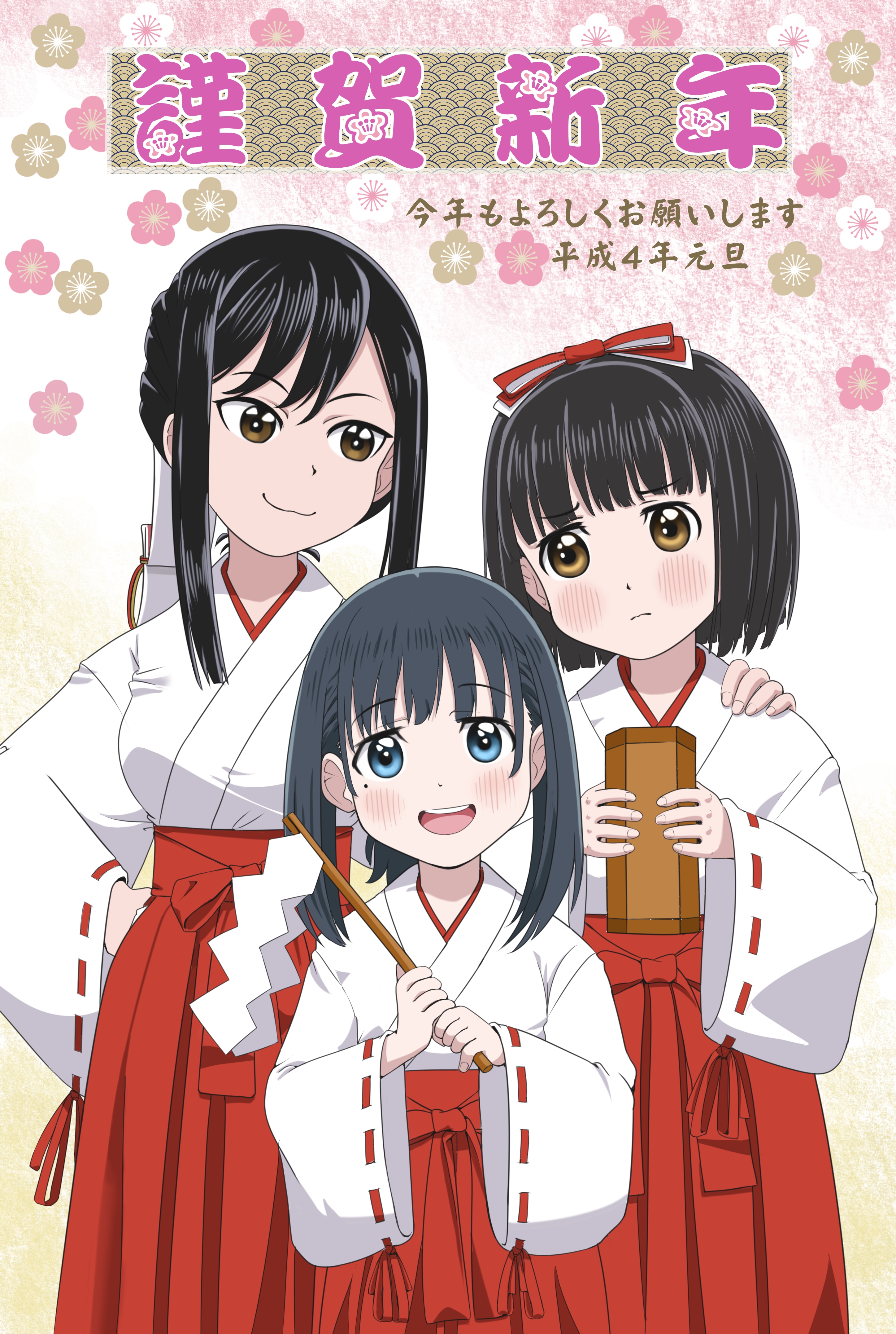 3girls absurdres black_hair blue_eyes blush breasts brown_eyes closed_mouth dot_nose eniwa_shii flower hand_on_another's_shoulder highres holding japanese_clothes japanese_text koguma_(super_cub) long_hair long_sleeves looking_at_viewer medium_breasts medium_hair miko mole mole_under_eye multiple_girls open_mouth reiko_(super_cub) standing su6546age super_cub teeth translation_request
