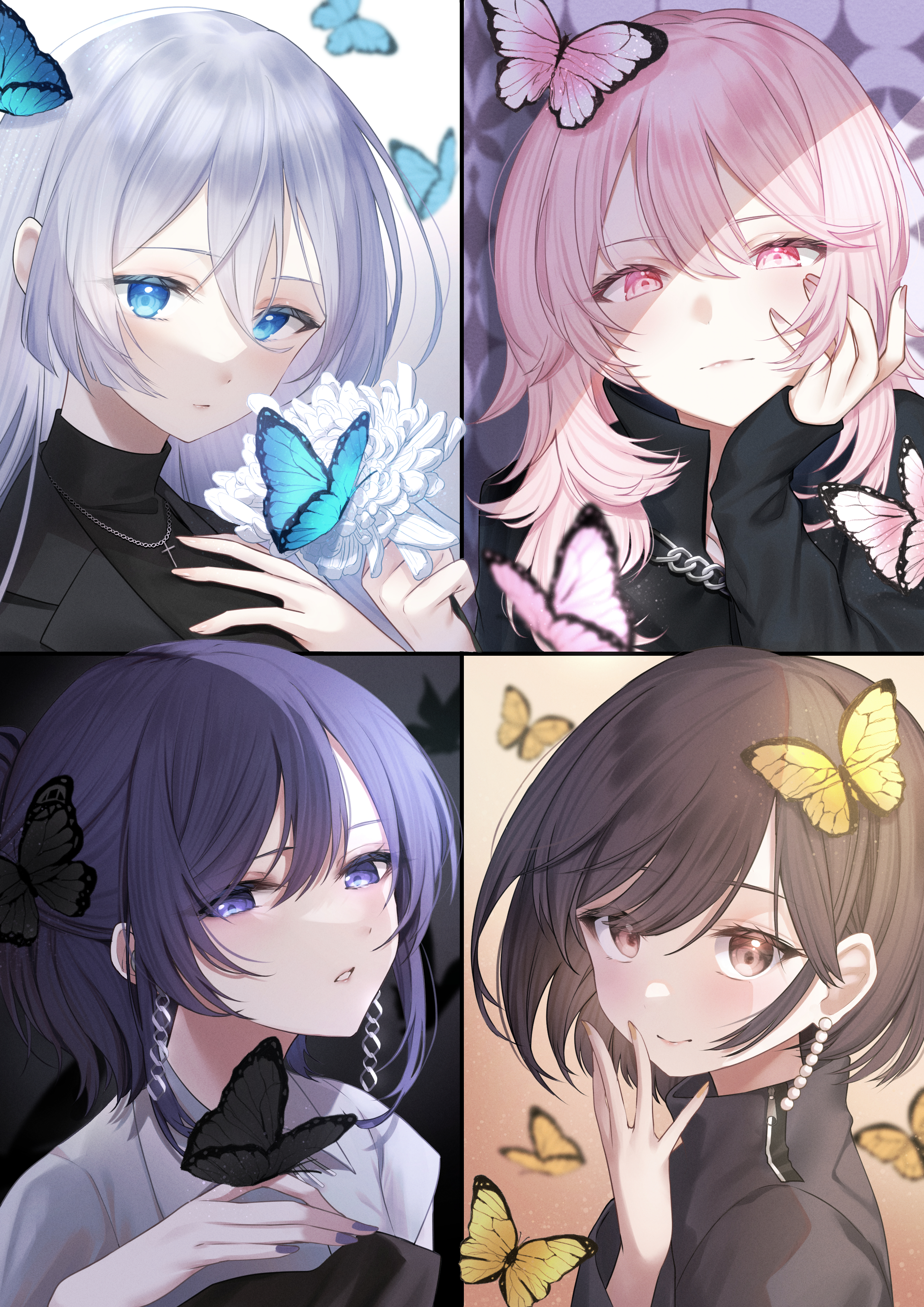 1other 3girls absurdres akiyama_mizuki asahina_mafuyu blue_eyes brown_eyes brown_hair bug butterfly commentary_request cross cross_necklace earrings expressionless flower half_updo hand_on_own_cheek hand_on_own_face hand_up high_collar highres insect jewelry long_hair long_sleeves looking_at_viewer lushuao medium_hair multiple_girls necklace parted_lips pearl_earrings pink_eyes pink_hair portrait project_sekai purple_eyes shinonome_ena short_hair sleeves_past_wrists smile turtleneck white_hair yoisaki_kanade zozotown