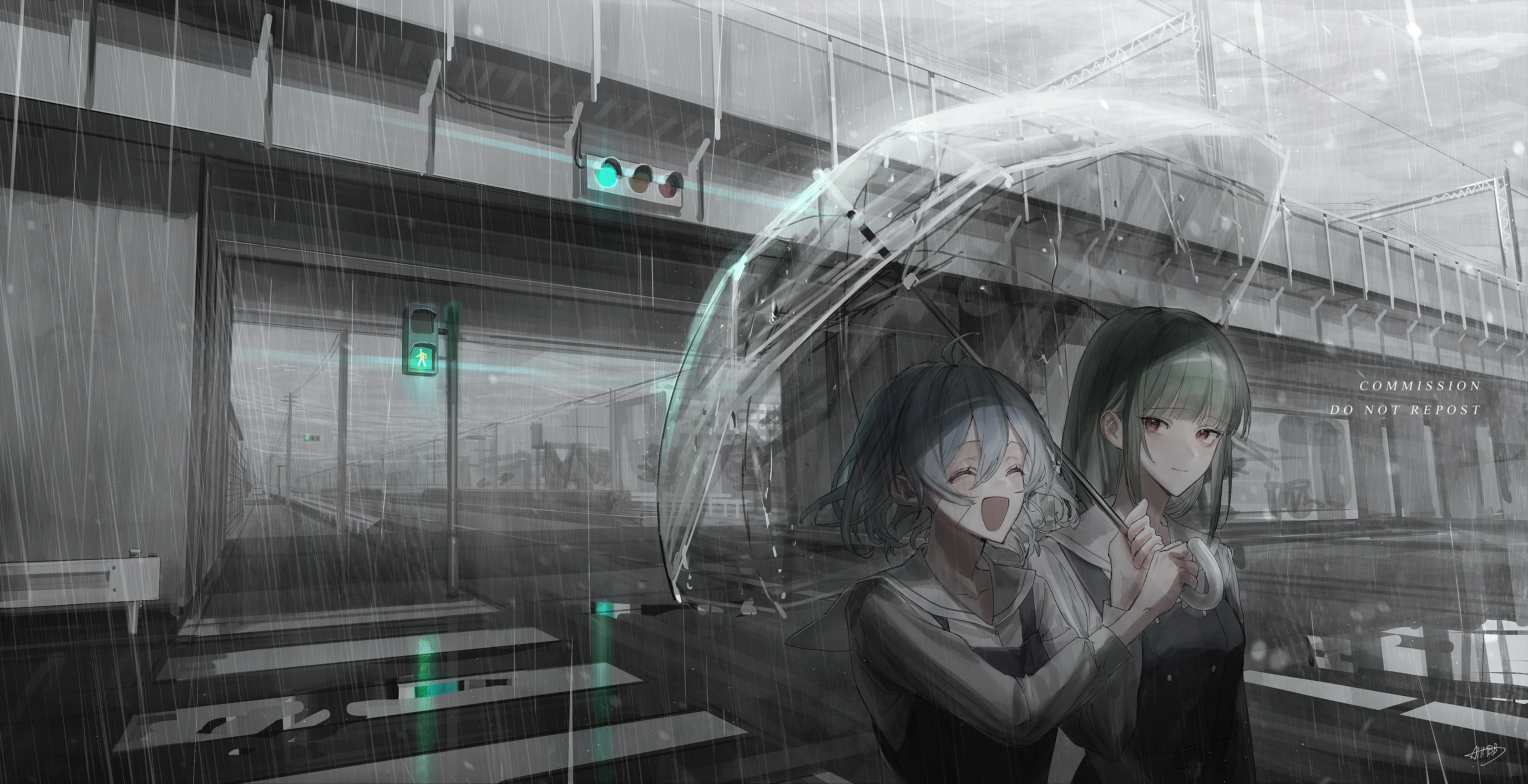 2girls absurdres ahoge blue_hair closed_eyes closed_mouth cloud cloudy_sky collarbone commentary commission crosswalk dress english_text floating_hair from_side gauze gauze_on_cheek green_hair hair_between_eyes hands_up highres holding holding_umbrella long_hair long_sleeves looking_at_another looking_to_the_side medium_hair multiple_girls muted_color open_mouth original outdoors overcast overpass perspective pinafore_dress power_lines puddle rain raised_eyebrows red_eyes reflective_floor road sailor_collar side-by-side sidelocks sidewalk sky sleeveless sleeveless_dress smile sowanai street traffic_light transparent transparent_umbrella umbrella upper_body utility_pole vanishing_point water_drop wide_shot wind