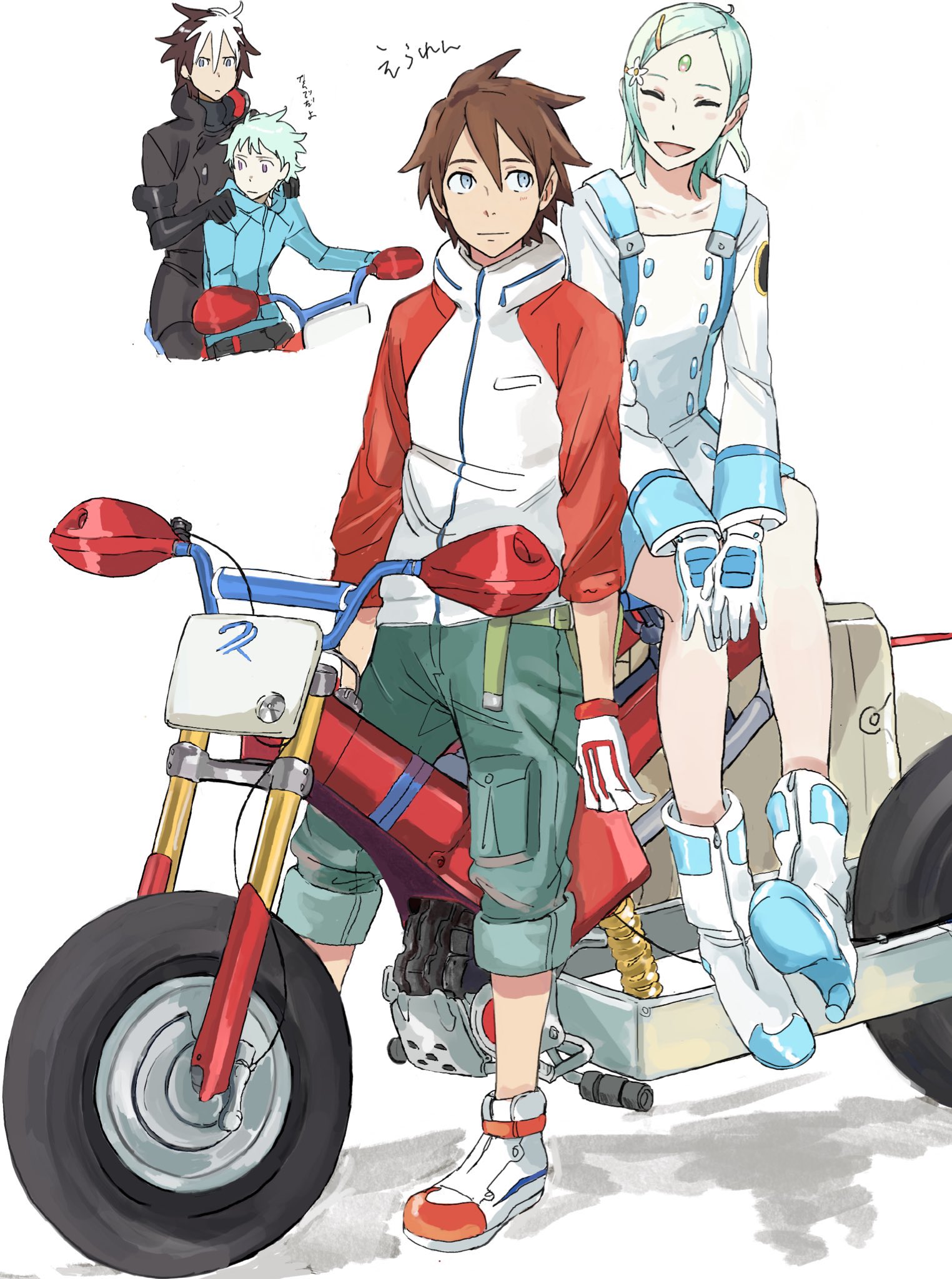1boy 1girl aged_up belt black_jacket black_pants blue_dress blue_eyes blue_footwear blue_gloves blue_jacket blush_stickers boots buttons capri_pants cargo_pants closed_eyes collarbone double-breasted dress eureka_(eureka_seven) eureka_seven eureka_seven_(series) eureka_seven_ao expressionless gloves green_belt hair_between_eyes hair_ornament hairclip high_heel_boots high_heels high_tops highres jacket long_sleeves looking_back messy_hair motor_vehicle motorcycle multicolored_hair multiple_views on_motorcycle open_mouth pale_skin pants purple_eyes raglan_sleeves red_footwear red_jacket renton_thurston rueisi_(namezari) shadow shoes short_dress short_hair simple_background sitting_sideways smile sneakers spiked_hair swept_bangs translated two-tone_dress two-tone_footwear two-tone_gloves two-tone_hair vehicle_request very_short_hair white_background white_dress white_footwear white_gloves white_hair white_jacket