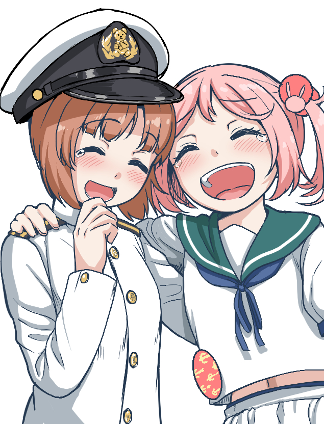 2girls admiral_(kancolle) admiral_(kancolle)_(cosplay) arm_around_back arm_around_shoulder blouse blue_neckerchief brown_hair closed_eyes commentary_request cosplay crossover girls_und_panzer green_sailor_collar hand_on_another's_shoulder hat jacket kantai_collection laughing long_sleeves midriff_peek military_hat military_uniform mimofu_(fullhighkick) multiple_girls navel neckerchief nishizumi_miho open_mouth peaked_cap pink_hair sailor_collar sazanami_(kancolle) shirt short_hair smile tearing_up twintails white_headwear white_jacket white_shirt