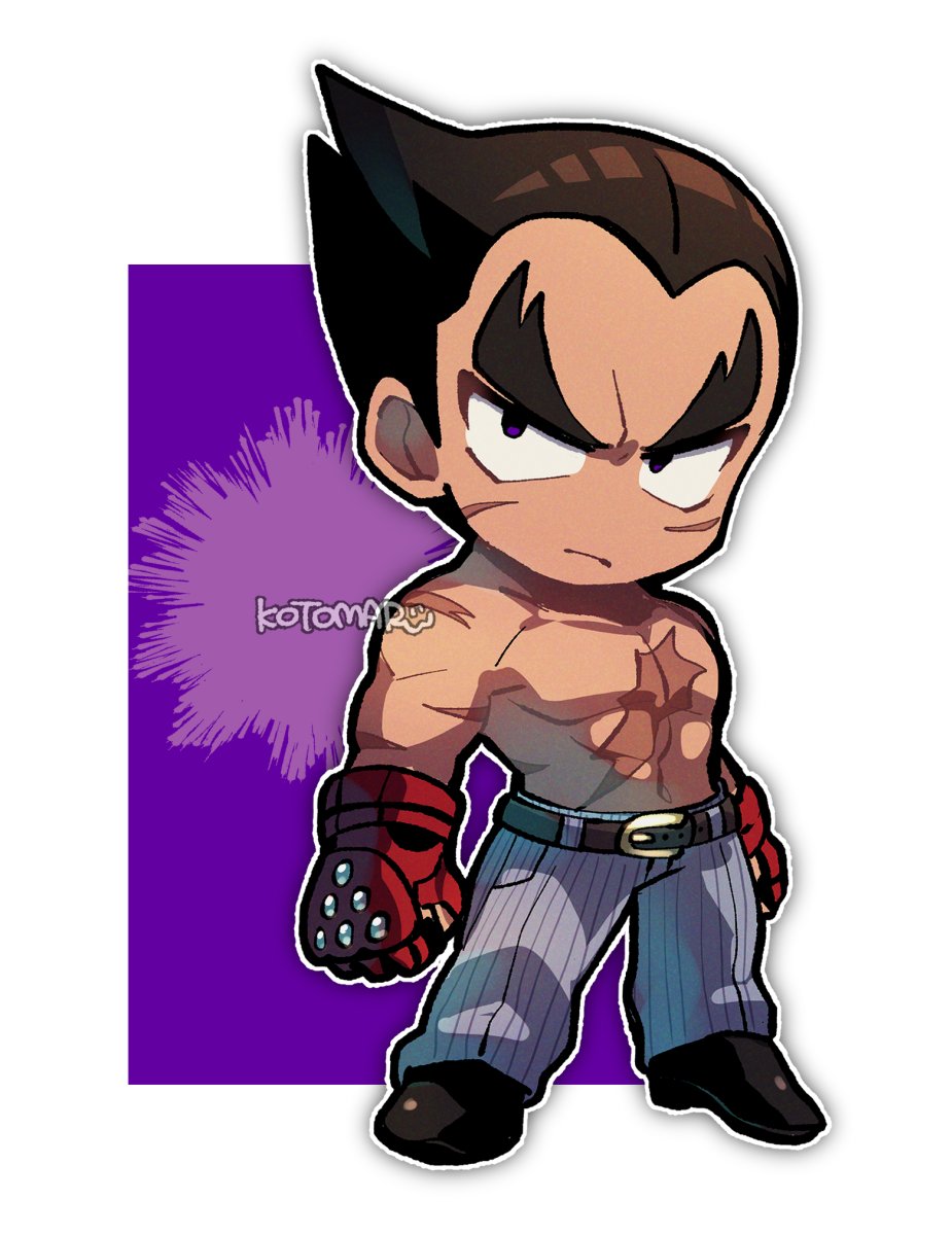 1boy arms_at_sides belt black_belt black_footwear black_hair chibi chibi_only clenched_hands closed_mouth facial_scar full_body gloves grey_pants highres kotomaru_(kotokoto_kottan) male_focus mishima_kazuya no_nose outline pants red_gloves scar scar_on_arm scar_on_cheek scar_on_chest scar_on_face signature studded_gloves tekken topless_male v-shaped_eyebrows white_outline
