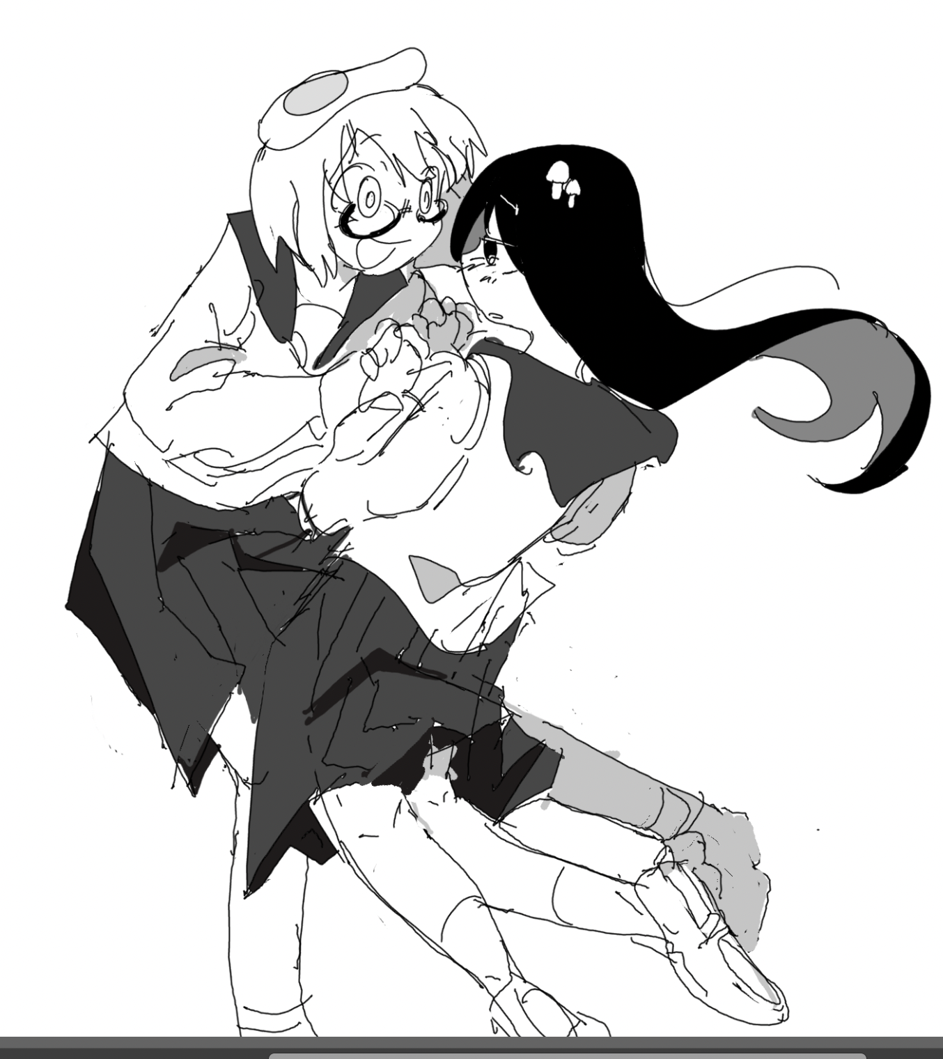 2girls :d :o blush commentary egg_(food) english_commentary food food_on_head fried_egg glasses greyscale highres holding_hands long_hair medium_hair monochrome multiple_girls mushroom_on_head object_on_head open_mouth pleated_skirt round_eyewear school_uniform serafuku shimeji_simulation simple_background skirt smile snowii_cat tsukishima_shijima white_background yamashita_majime