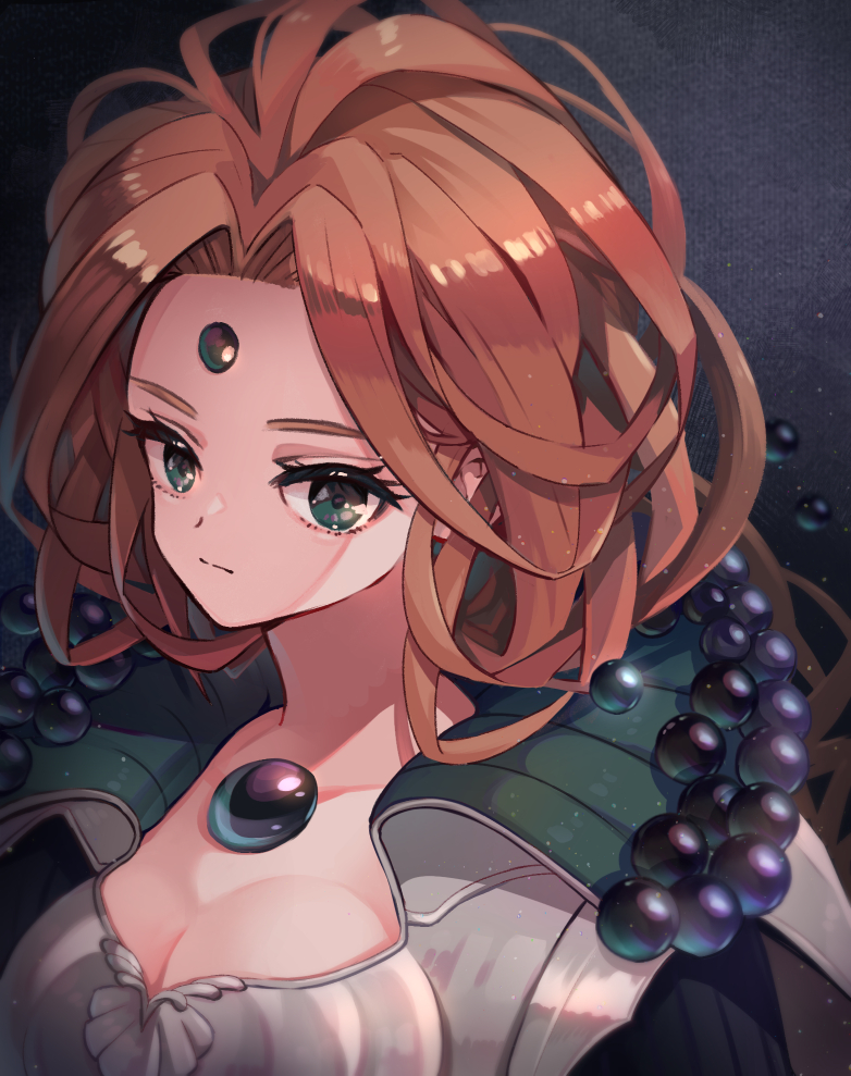 1girl black_background blackpearl bodice breasts brown_hair chest_jewel cleavage collared_cloak commentary_request cropped_torso expressionless forehead_jewel gem green_eyes legend_of_mana looking_at_viewer medium_breasts orb seiken_densetsu solo souichi