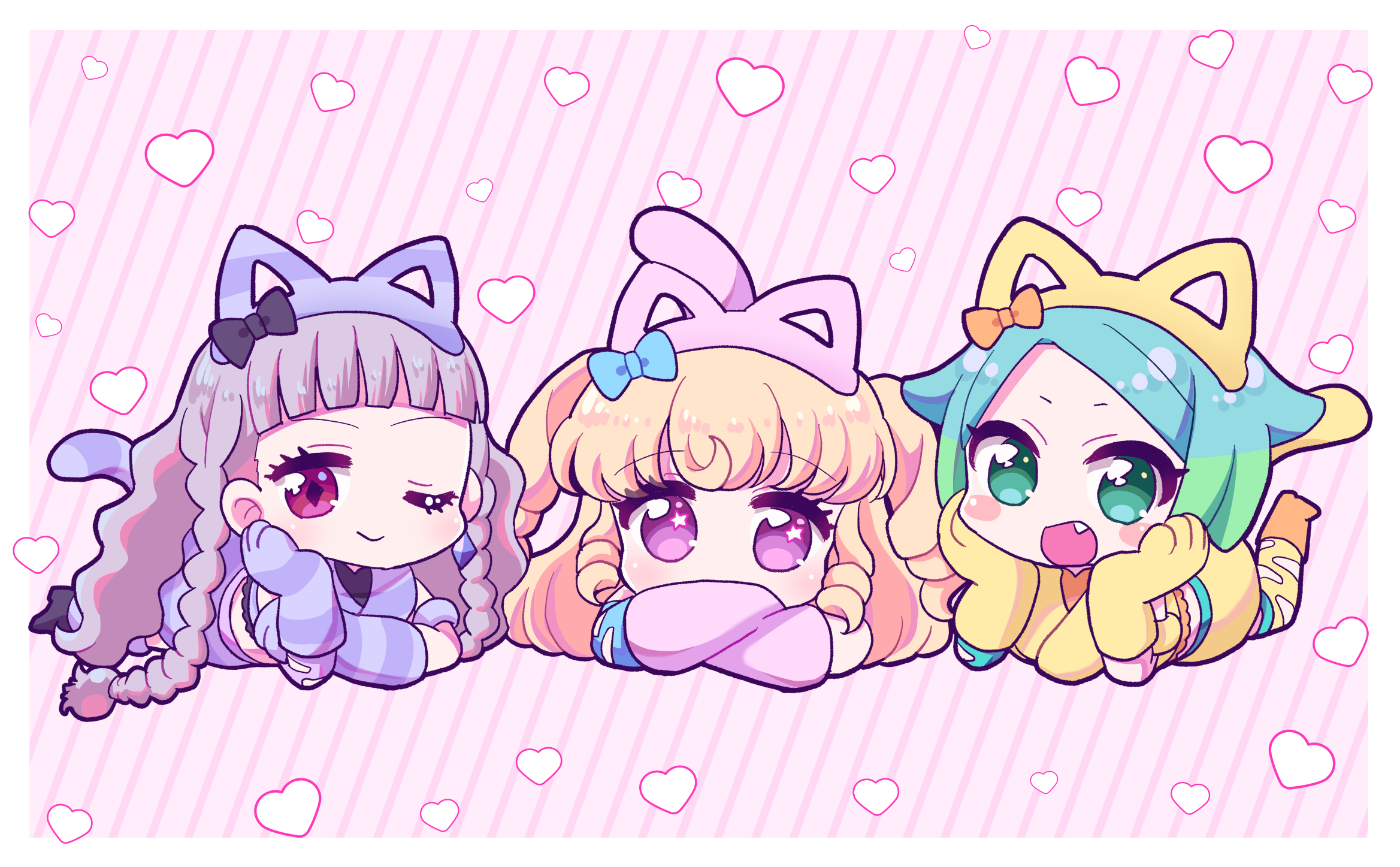 3girls :d animal_ear_hairband animal_ears animal_hands black_bow blonde_hair blue_bow blue_hair blunt_bangs bow braid cat_ear_hairband cat_ears cat_tail chibi closed_mouth crossed_arms diamond_earrings earrings fake_animal_ears fang gloves green_eyes green_hair grey_hair hair_bow hairband hand_on_own_cheek hand_on_own_face heart heart_background highres idol_clothes idol_time_pripara jewelry koda_michiru koyoshi_yoko long_hair long_sleeves looking_at_viewer lying miichiru_(pripara) multicolored_hair multiple_girls nijiiro_nino on_stomach one_eye_closed open_mouth orange_bow paw_gloves pink_background pretty_series pripara purple_eyes purple_hair red_eyes ringlets short_hair smile striped_background swept_bangs tail twin_braids two_side_up very_long_hair wavy_hair yellow_hairband yumekawa_yui