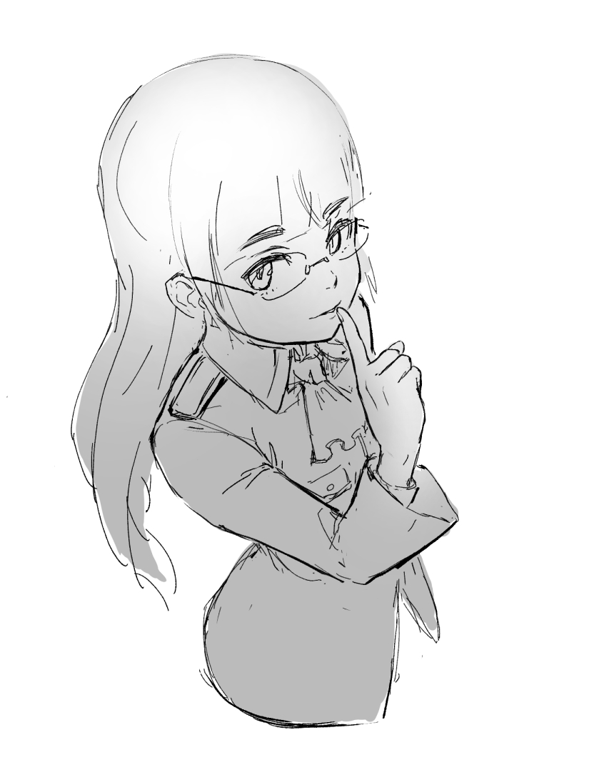 1girl glasses greyscale long_hair looking_at_viewer military_uniform monochrome perrine_h._clostermann shiri_chin sketch solo strike_witches world_witches_series