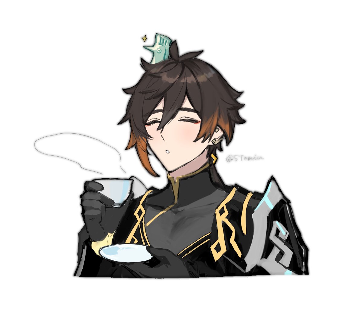 1boy 5tomiu chibi chibi_inset chinese_clothes cup genshin_impact hanfu holding_cup official_alternate_costume saucer solo steam teacup twitter white_background zhongli_(genshin_impact)