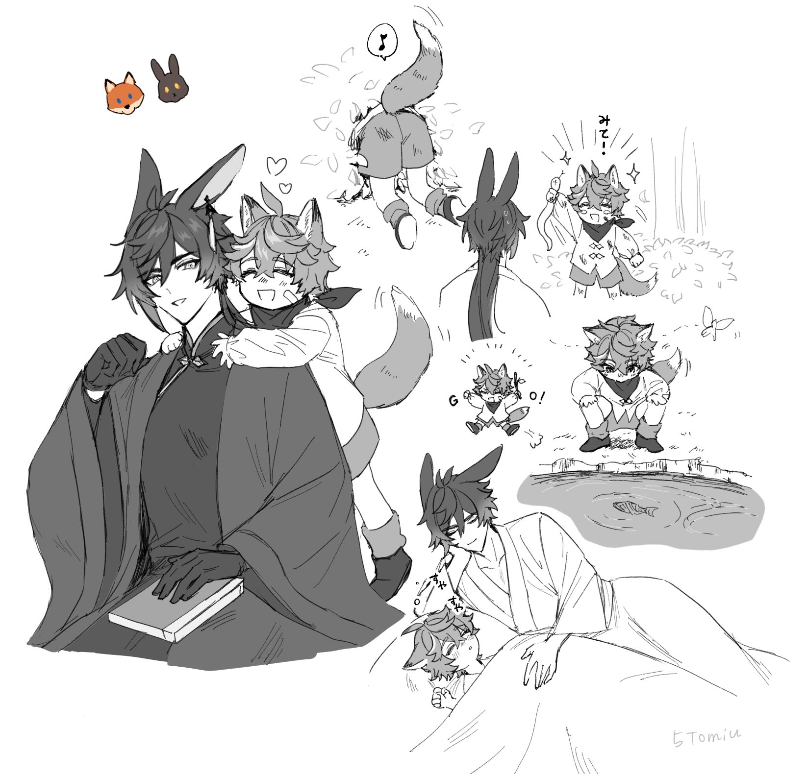 2boys 5tomiu age_difference aged_down alternate_costume animal_ears book chinese_clothes fox_ears fox_tail genshin_impact greyscale hanfu highres monochrome multiple_boys pond rabbit_ears robe sleeping snake tail tartaglia_(genshin_impact) twitter white_background zhongli_(genshin_impact)