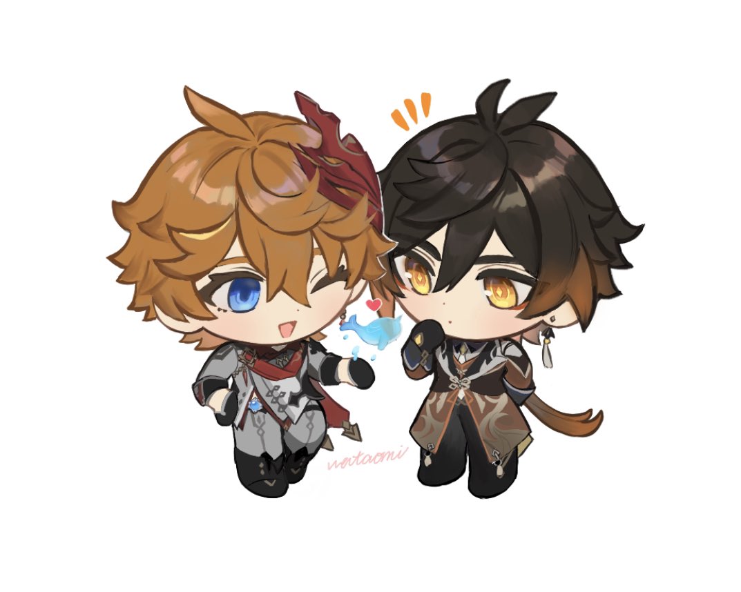 2boys 5tomiu chibi genshin_impact heart multiple_boys notice_lines tartaglia_(genshin_impact) whale white_background zhongli_(genshin_impact)