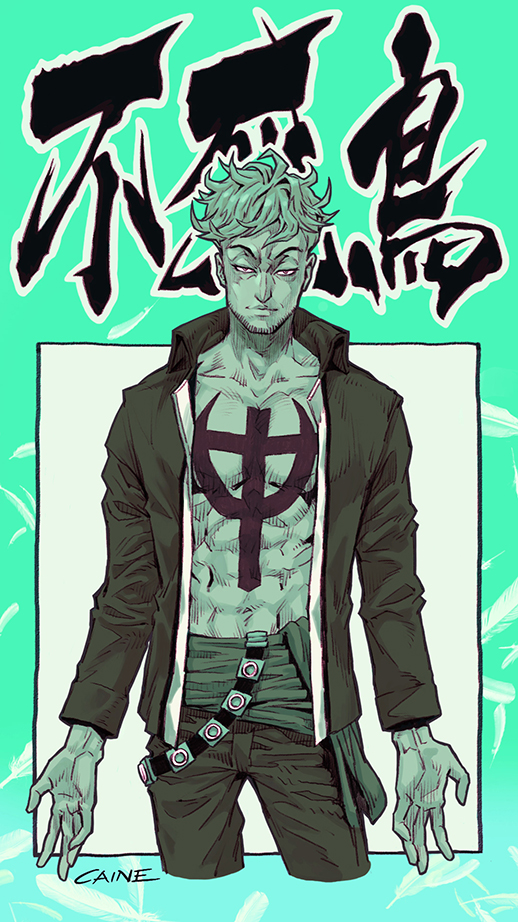 1boy abs anchor_tattoo artist_name caine666 chest_tattoo closed_mouth facial_hair looking_at_viewer male_focus marco_(one_piece) mohawk one_piece open_clothes short_hair solo tattoo third-party_source translation_request
