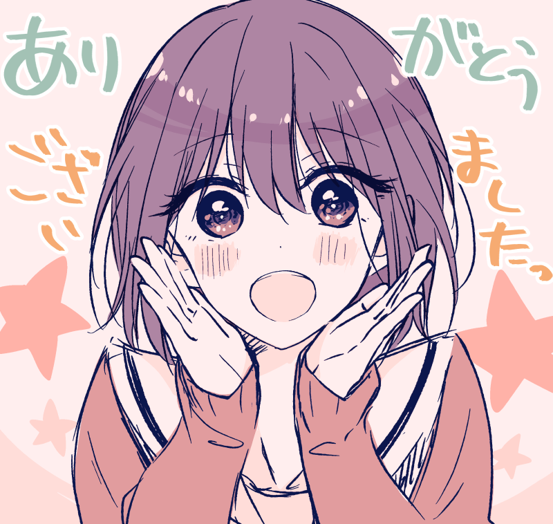 1boy banjou_azusa black_hair blush cardigan crossdressing crossdressing_(mtf) hair_between_eyes hand_on_own_face hiura_mihate koisuru_(otome)_no_tsukurikata limited_palette long_sleeves looking_at_viewer male_focus open_mouth pink_eyes pink_serafuku sailor_collar school_uniform serafuku short_hair simple_background smile solo star_(symbol) trap