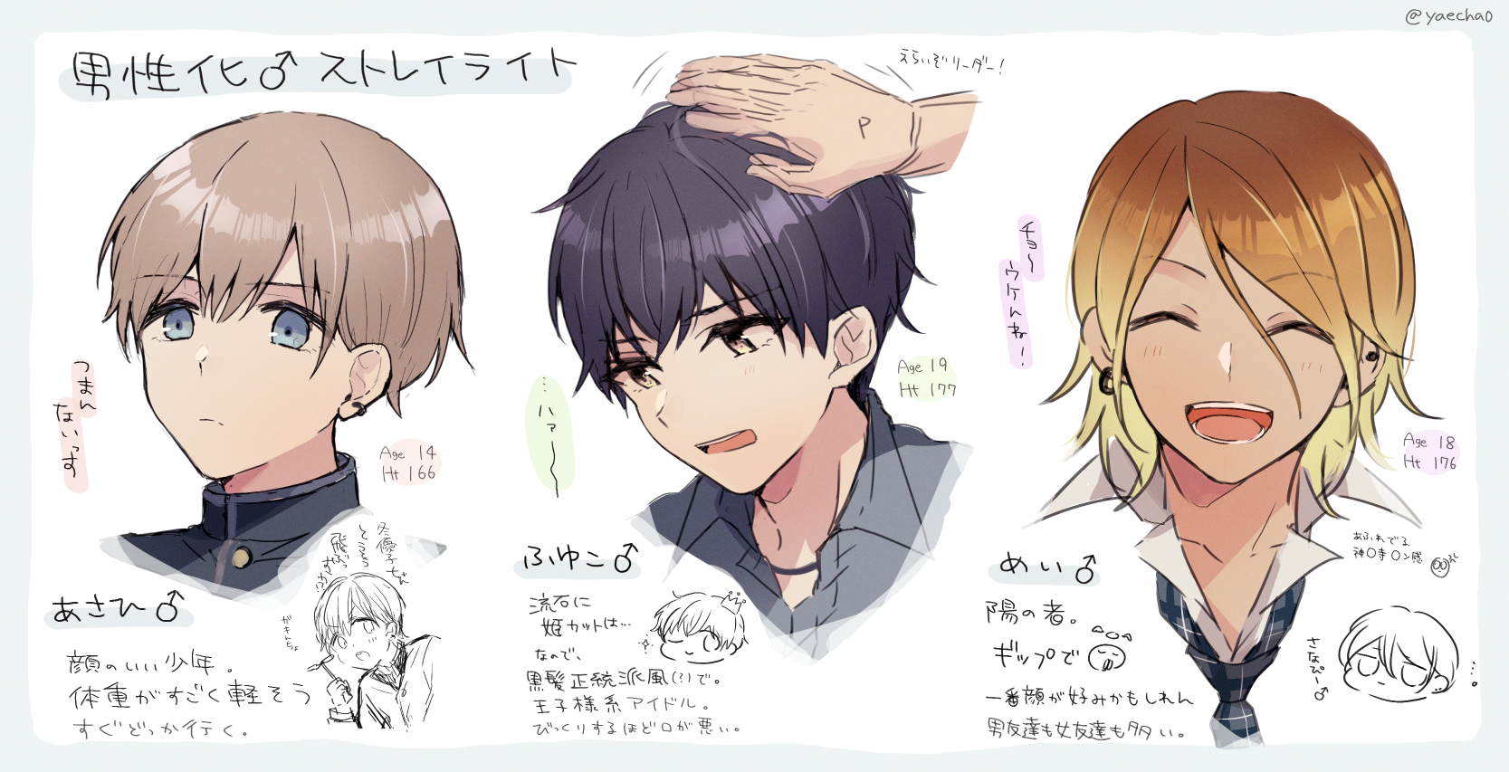 3boys chibi chibi_inset earrings genderswap genderswap_(ftm) headpat highres idolmaster idolmaster_shiny_colors izumi_mei jewelry kumano09_(yaecha0) mayuzumi_fuyuko multiple_boys serizawa_asahi single_earring smile straylight_(idolmaster) tagme twitter_username