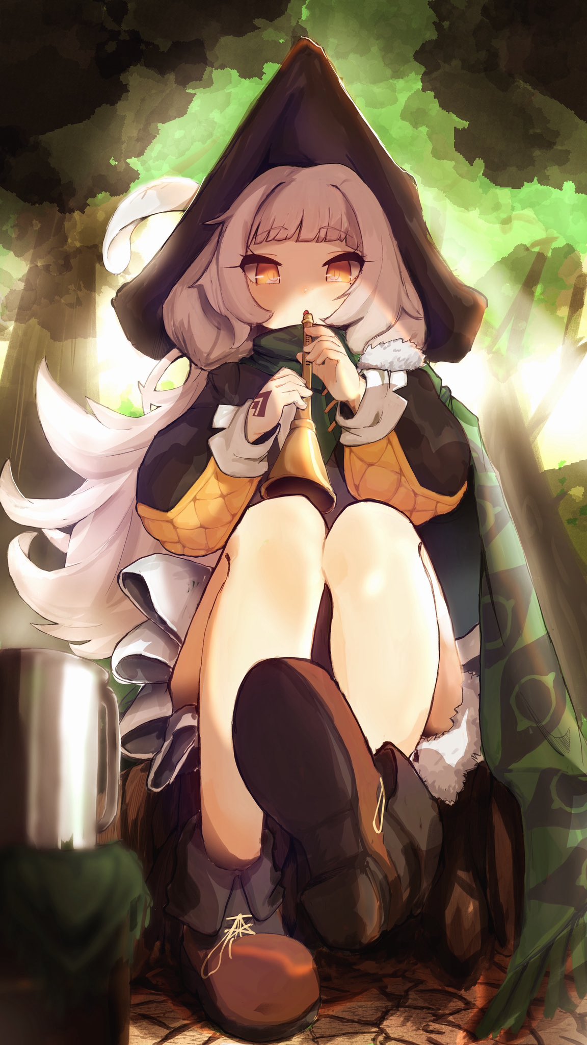 1girl azur_lane black_headwear brown_footwear cape flute forest from_below green_cape grey_hair hands_up hat_feather hat_ornament highres holding holding_flute holding_instrument instrument leaf long_hair long_sleeves looking_at_viewer mole mole_under_eye music nature official_alternate_costume outdoors playing_flute playing_instrument roli7946 sitting solo tree white_hair yellow_eyes z46_(azur_lane) z46_(the_bard_of_hamelin)_(azur_lane)