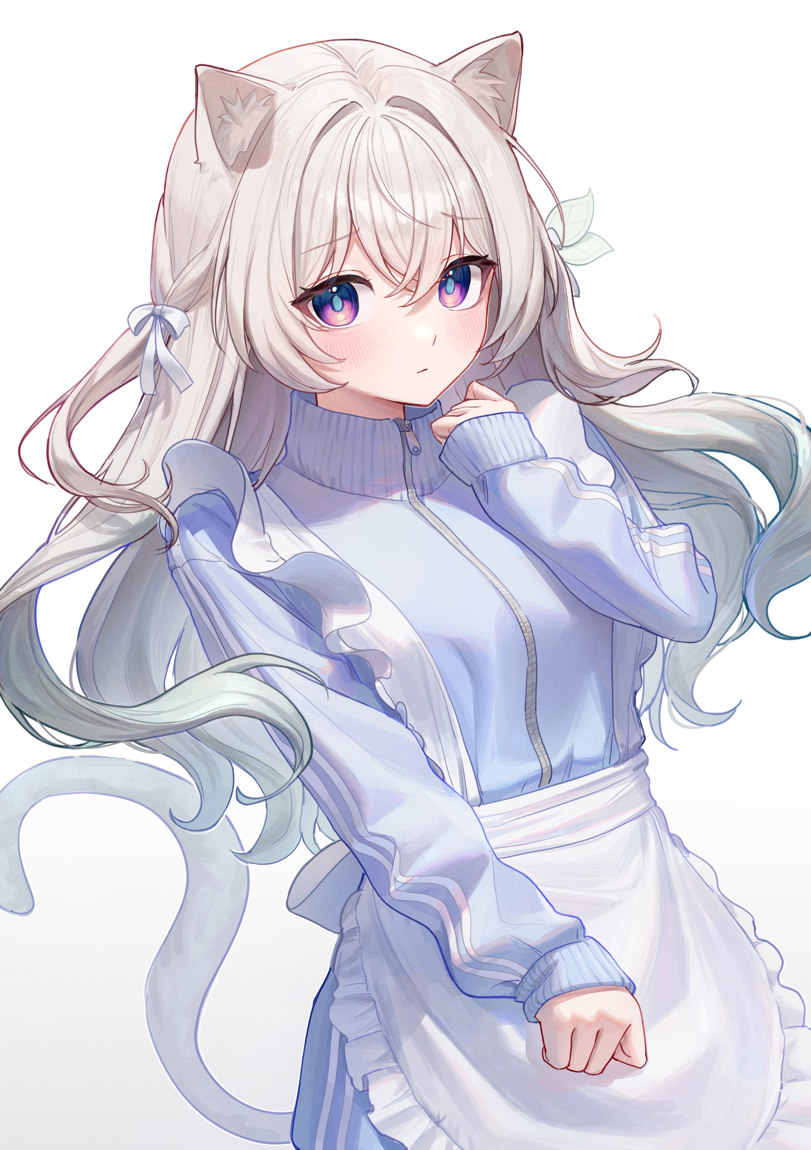 1girl absurdres alternate_costume animal_ears apron blue_jacket blush cat_ears cat_girl cat_tail chabi009 clenched_hands closed_mouth firefly_(honkai:_star_rail) frilled_apron frills grey_hair hair_between_eyes hair_ornament hand_up hashtag-only_commentary highres honkai:_star_rail honkai_(series) jacket japanese_clothes kemonomimi_mode long_hair long_sleeves looking_at_viewer maid puffy_long_sleeves puffy_sleeves purple_eyes simple_background solo tail track_jacket upper_body wa_maid waist_apron white_apron white_background
