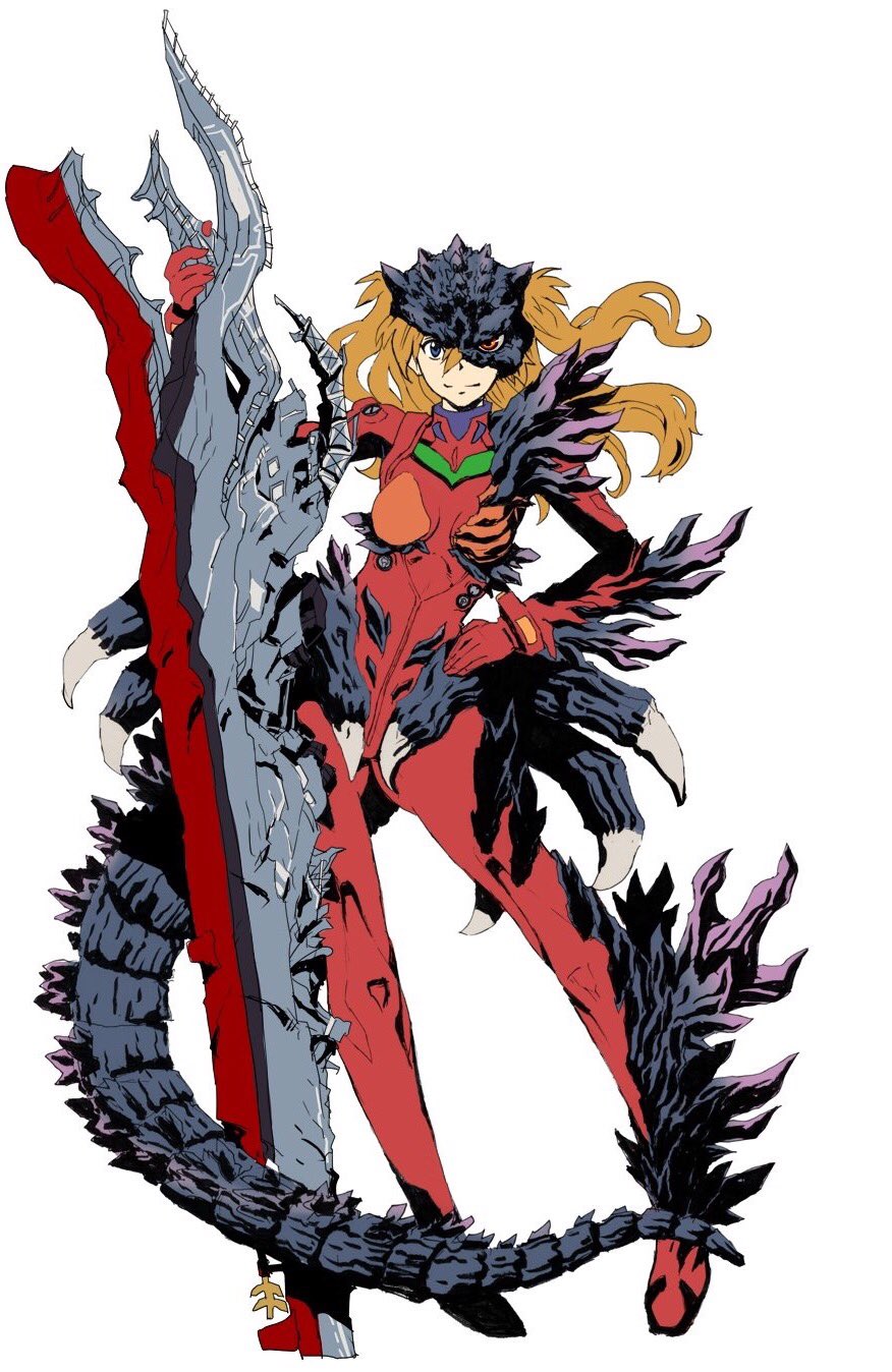 1girl bodysuit breasts claws female_focus giant giant_monster gluteal_fold godzilla godzilla_(series) highres honzawa_yuuichirou jumpsuit kaiju long_hair mecha_pilot_suit medium_breasts monster neon_genesis_evangelion orange_hair plugsuit_(evangelion) red_bodysuit souryuu_asuka_langley tail tight_clothes toho weapon