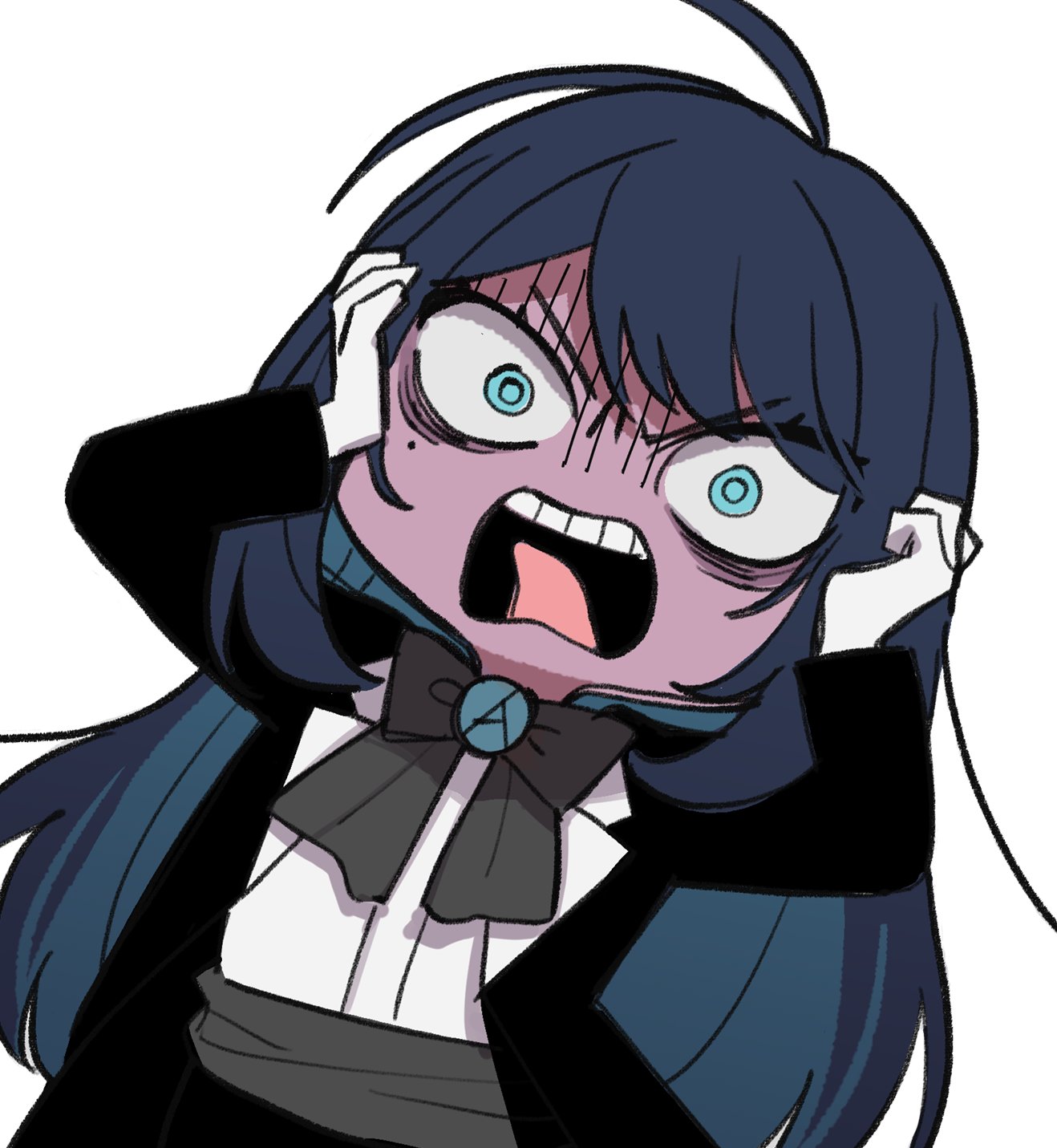1girl ado_(utaite) ahoge black_bow black_bowtie black_coat blue_eyes blue_hair bow bowtie brooch chando_(ado) cloud_nine_inc coat collared_shirt colored_inner_hair commentary dress_shirt hashtag-only_commentary highres jewelry long_hair long_sleeves looking_at_viewer mole mole_under_eye multicolored_hair open_clothes open_coat open_mouth riseno shirt simple_background solo teeth upper_teeth_only utaite white_background white_shirt wide-eyed