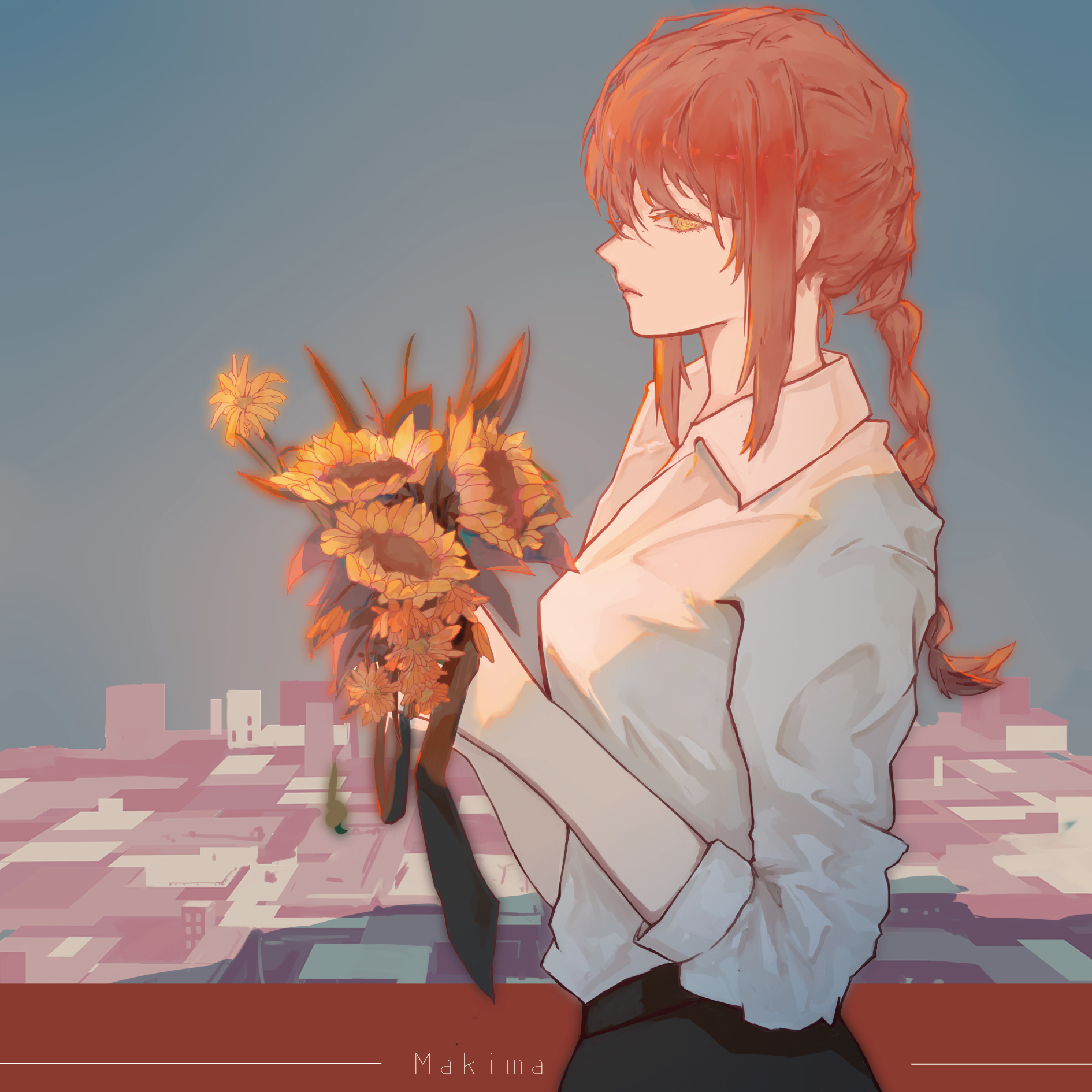 1girl baililiwan braid chainsaw_man closed_mouth collared_shirt demon_girl flower highres makima_(chainsaw_man) red_hair ringed_eyes shirt sideways_glance single_braid solo sunflower white_shirt yellow_eyes
