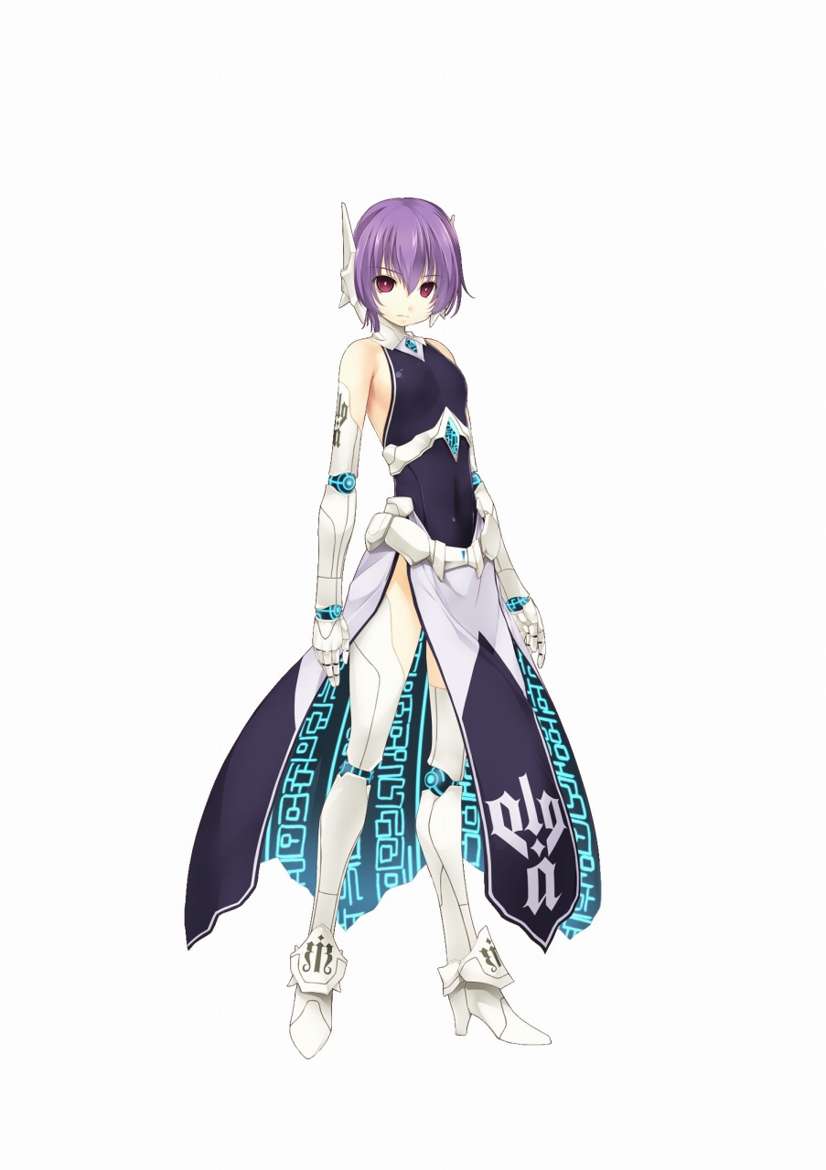 1girl astel(wizards_symphony) atelier-moo bare_shoulders closed_mouth flat_chest full_body golem hair_between_eyes highres looking_at_viewer mechanical_arms navel purple_hair red_eyes robot_ears short_hair simple_background solo standing thighs white_background wizards_symphony