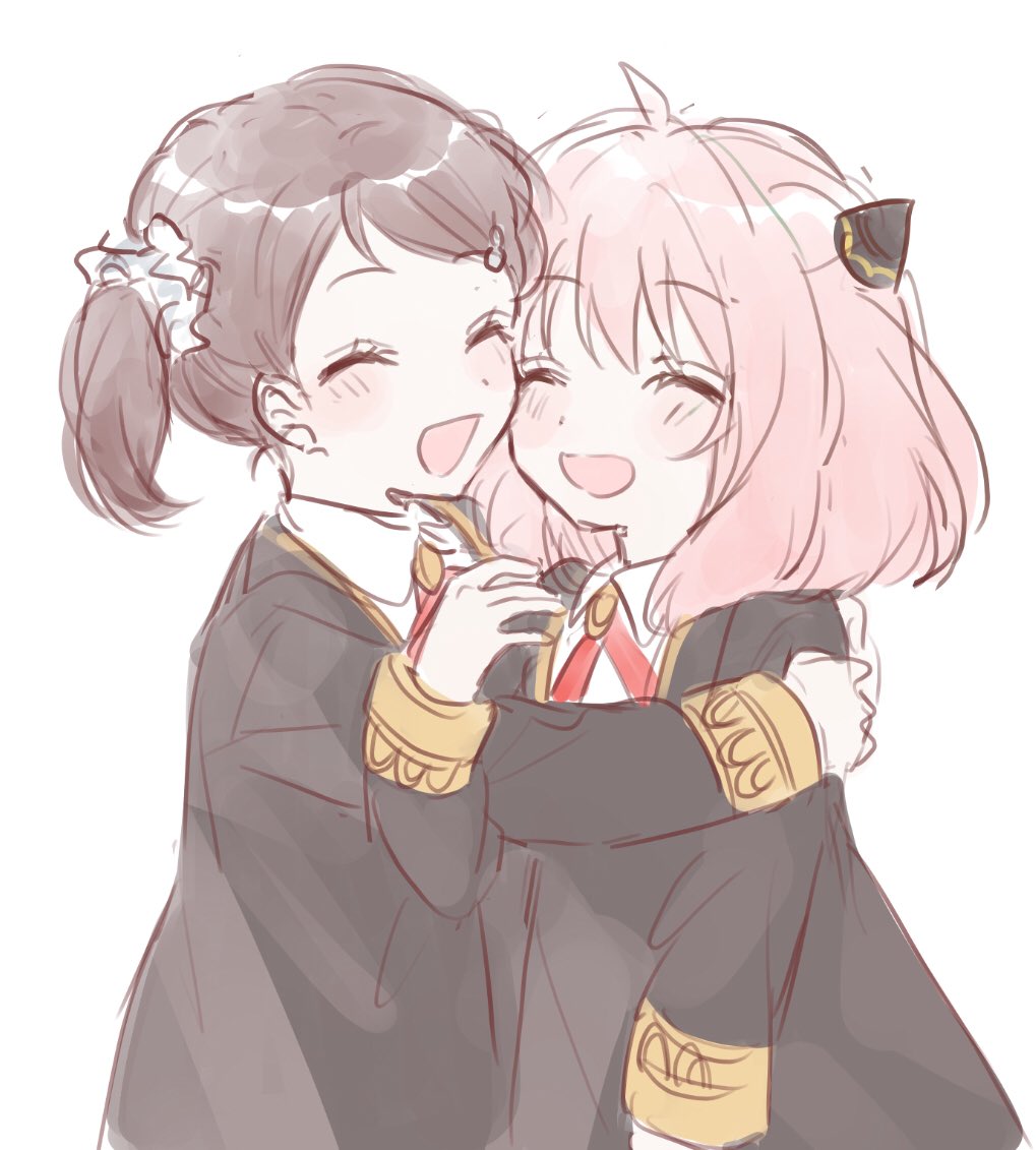2girls ahoge anya_(spy_x_family) becky_blackbell black_dress blush brown_hair child closed_eyes collared_shirt dress eden_academy_school_uniform enefue hair_between_eyes hair_ornament hairpin hairpods hand_up happy hug long_sleeves multiple_girls neck_ribbon open_mouth pink_hair red_ribbon ribbon school_uniform shirt short_hair short_twintails simple_background smile spy_x_family standing twintails white_background white_shirt