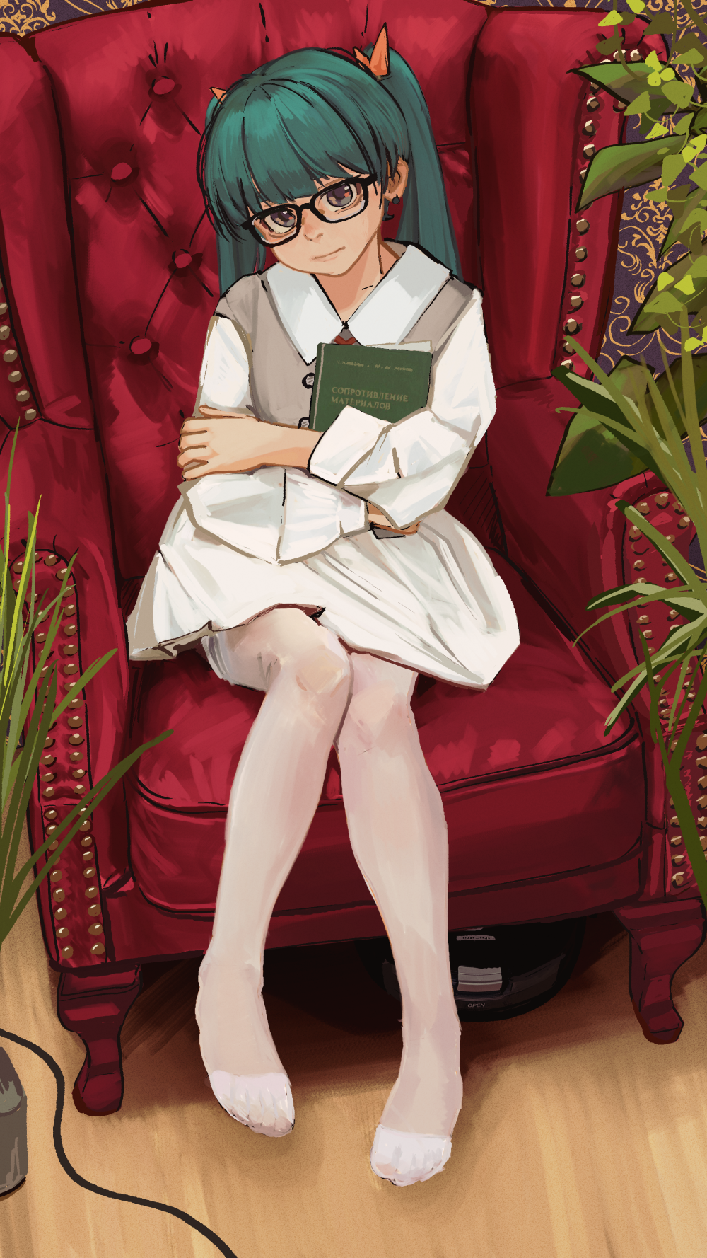 1girl :| armchair black-framed_eyewear book brown_eyes brown_vest cable chair closed_mouth commentary earrings expressionless full_body glasses green_hair hair_ribbon head_tilt highres holding holding_book hugging_object jewelry knees_together_feet_apart long_hair looking_at_viewer necktie no_shoes on_chair orange_ribbon original pantyhose pigeon-toed plant potted_plant rectangular_eyewear red_necktie ribbon robotic_vacuum_cleaner russian_text sasha_(servachok) servachok shirt sitting skirt solo stud_earrings thick_eyebrows translated twintails vest white_pantyhose white_shirt white_skirt wooden_floor