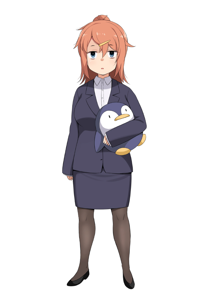 1girl black_footwear black_pantyhose black_skirt black_suit blue_eyes breasts business_suit collared_shirt expressionless formal_clothes full_body high_heels holding holding_stuffed_toy honda_naoki large_breasts long_sleeves michinoku_komaro office_lady open_mouth pantyhose pencil_skirt pink_hair pumps seitokai_ni_mo_ana_wa_aru! shirt simple_background skirt sleeves_past_wrists solo stuffed_animal stuffed_penguin stuffed_toy suit white_background white_shirt