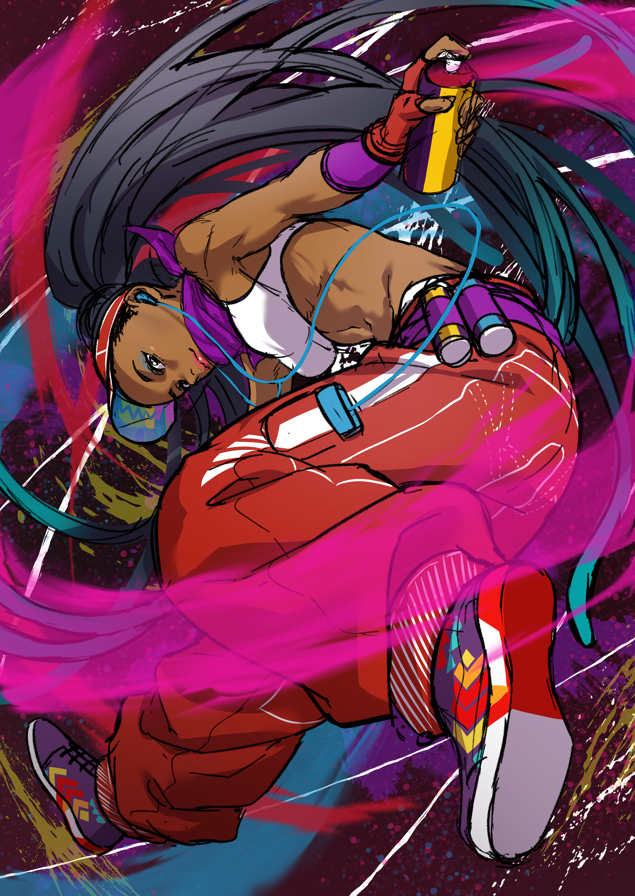 1girl absurdres alternate_hairstyle baggy_pants black_hair blue_eyeshadow breasts cable colored_tips commentary dark-skinned_female dark_skin earbuds earphones english_commentary eyeshadow fingerless_gloves full_body gloves hat highres holding kimberly_jackson lipstick long_hair looking_at_viewer makeup medium_breasts midriff multicolored_hair neckerchief official_alternate_costume pants pink_lips ponytail purple_neckerchief red_gloves red_hat red_pants shoes sleeveless sneakers solo sports_bra spray_can street_fighter street_fighter_6 sumino_akasuke toned toned_female very_dark_skin very_long_hair visor_cap walkman white_sports_bra