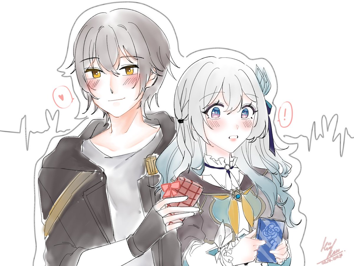 1boy 1girl black_coat blush caelus_(honkai:_star_rail) coat fingerless_gloves firefly_(honkai:_star_rail) gloves grey_hair hair_between_eyes hetero jacket light_smile long_hair mindhew multicolored_eyes shirt trailblazer_(honkai:_star_rail) two-tone_eyes valentine yellow_eyes