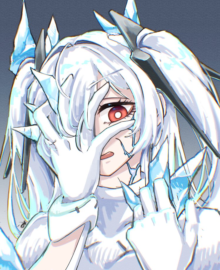 1girl bodysuit cinderella_(nikke) crystal ex-mist goddess_of_victory:_nikke hand_over_eye long_hair open_mouth portrait red_eyes scar solo twintails very_long_hair white_bodysuit white_hair