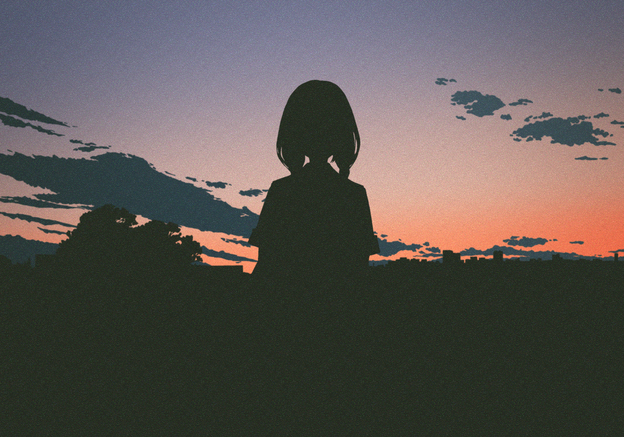 1girl amemori_sayo amemori_sayo_(2nd_costume) cloud dusk facing_viewer highres horizon long_hair nijisanji nkymyura outdoors shadow sky solo tree twilight twintails virtual_youtuber