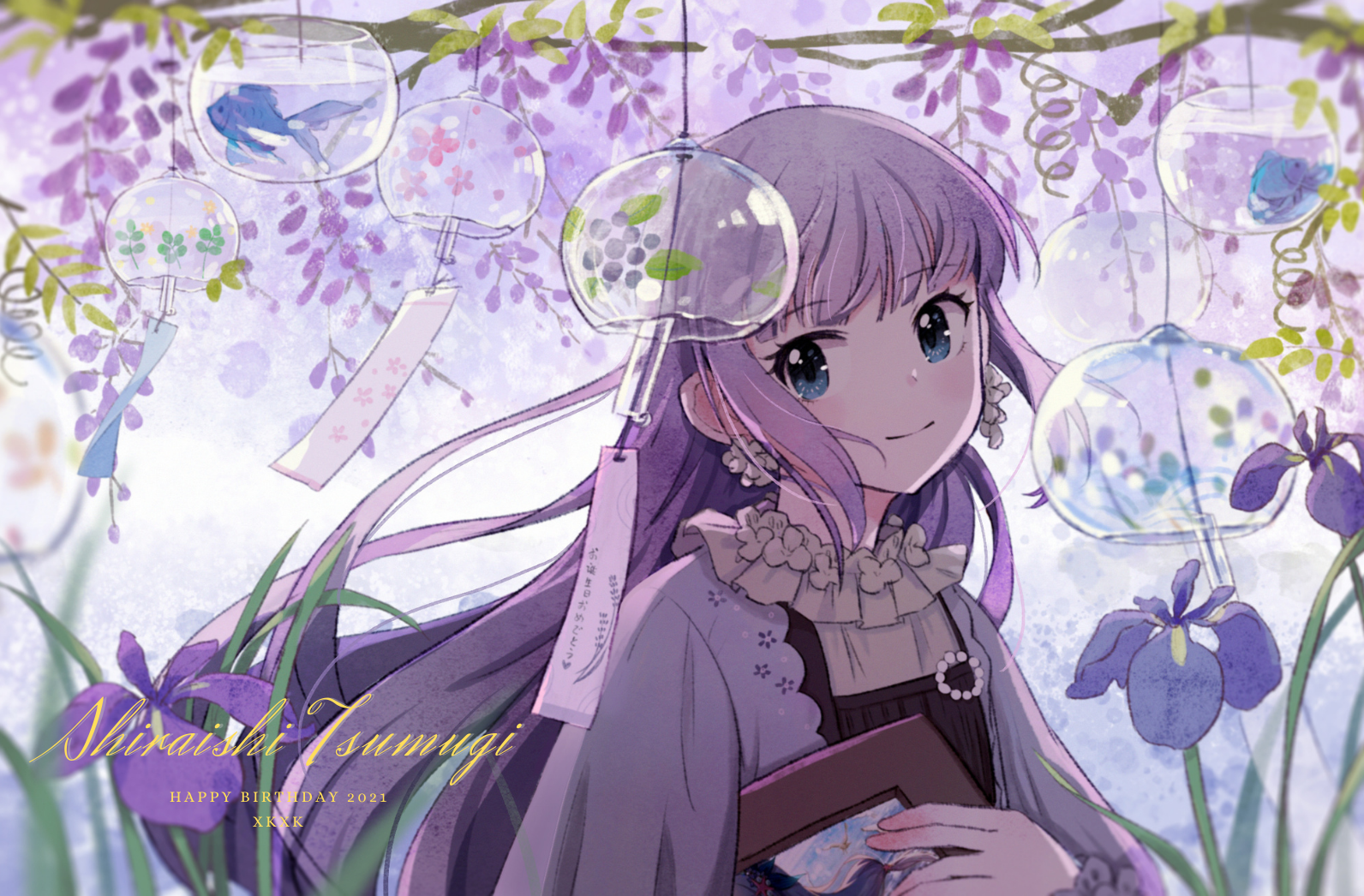 1girl 2021 beads bird black_dress blue_eyes blurry book character_name closed_mouth dress earrings english_text fish flower flower_earrings frills happy_birthday holding holding_book idolmaster idolmaster_million_live! idolmaster_million_live!_theater_days jewelry long_hair long_sleeves looking_at_viewer purple_flower purple_hair purple_theme shiraishi_tsumugi shirt smile solo upper_body wind_chime wisteria xk_xk