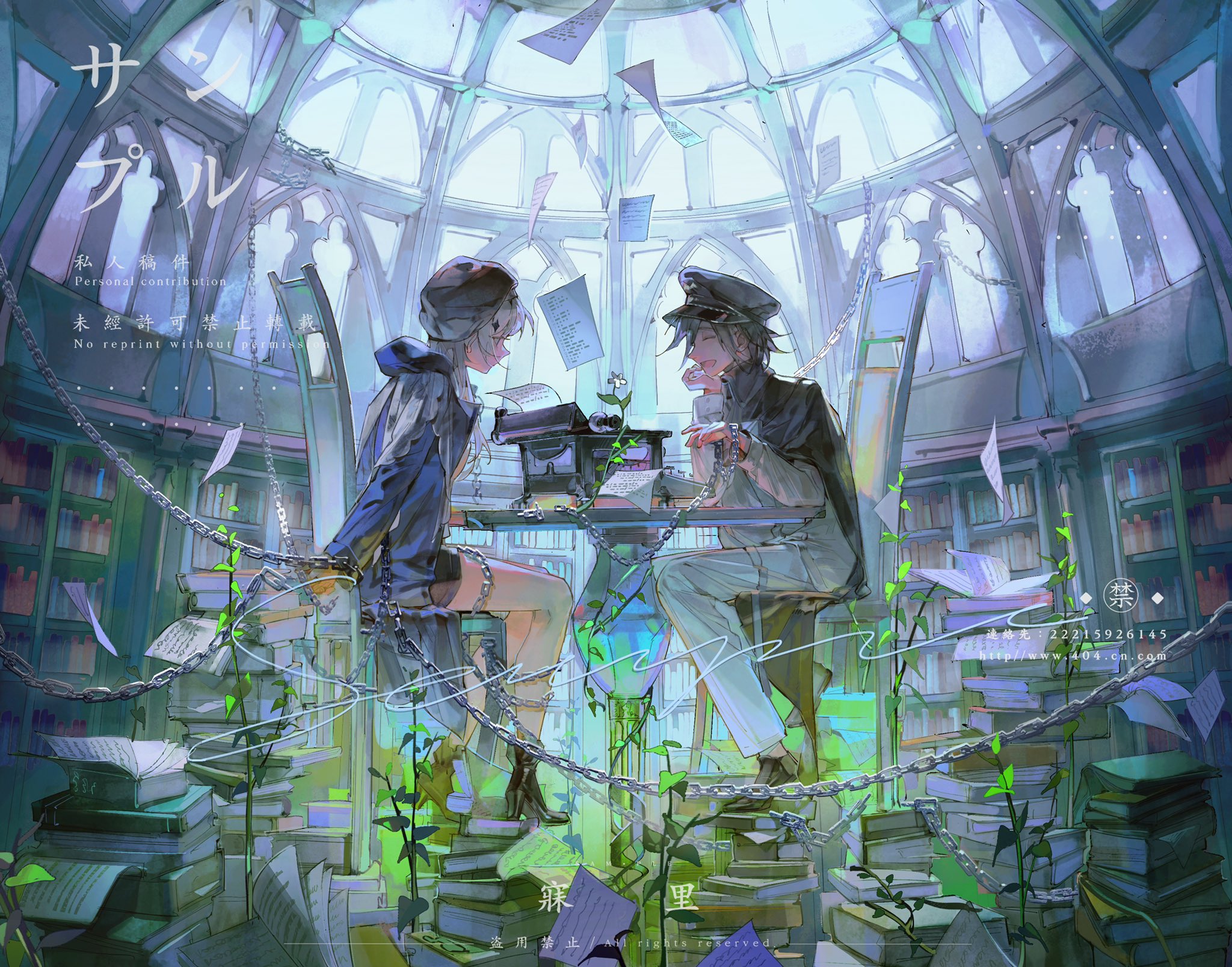 1boy 1girl bare_legs black_footwear black_hair black_headwear blue_jacket book book_stack bookshelf brown_hair cape chain chair cuffs cup dome facial_hair from_side hat highres holding hood indoors jacket long_sleeves looking_at_another original pants paper peaked_cap plant sailor_hat sample_watermark shirt short_hair shorts sitting table watermark web_address white_pants window youliyouliv