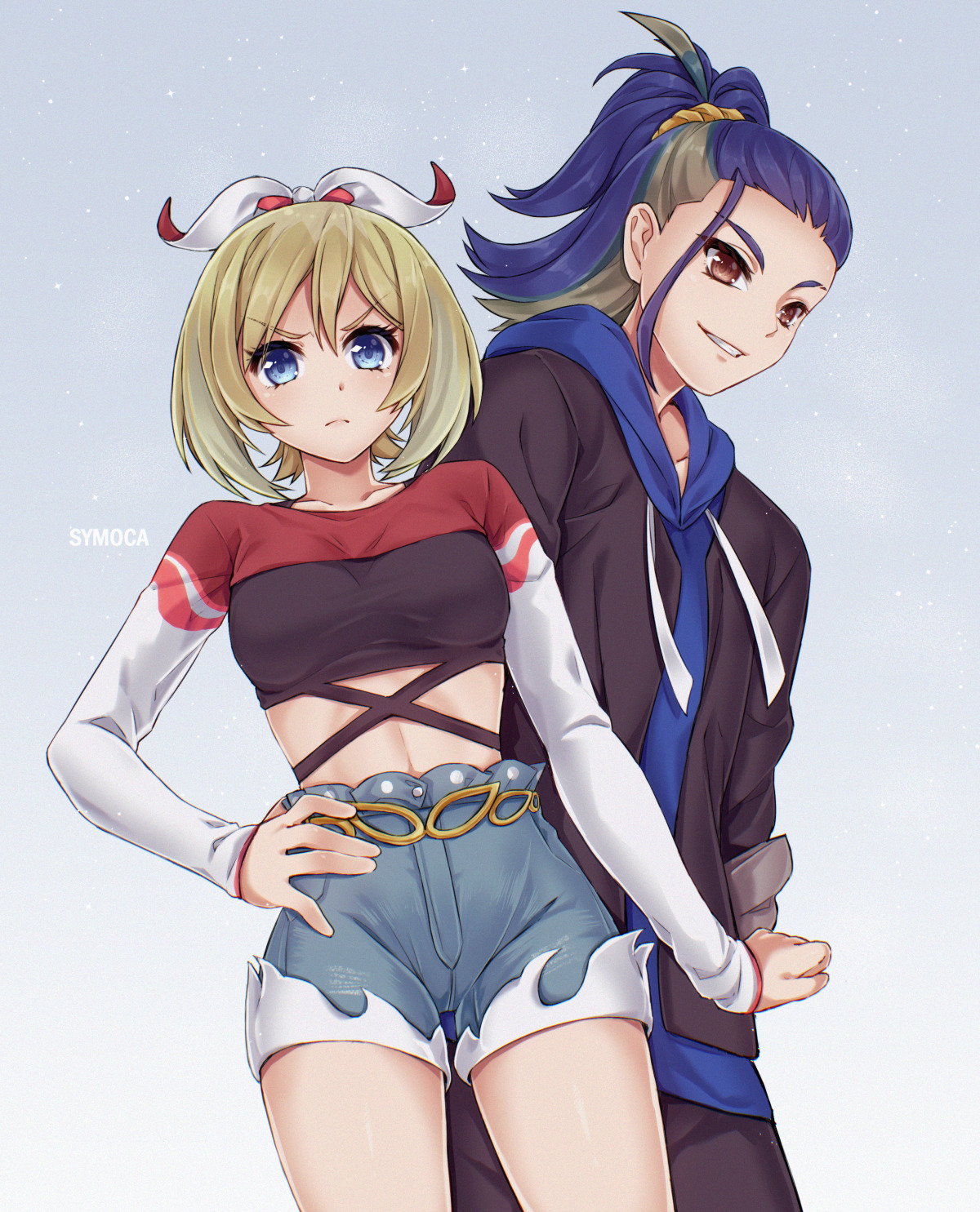 1boy 1girl adaman_(pokemon) adaman_(special_costume)_(pokemon) artist_name blonde_hair blue_eyes blue_hoodie breasts brown_eyes collarbone cowboy_shot denim denim_shorts eyebrow_cut gradient_background grey_background hand_on_own_hip highres hood hoodie irida_(pokemon) irida_(special_costume)_(pokemon) looking_at_viewer medium_breasts midriff multicolored_hair navel nintendo official_alternate_costume pokemon pokemon_masters_ex shorts symoca two-tone_hair