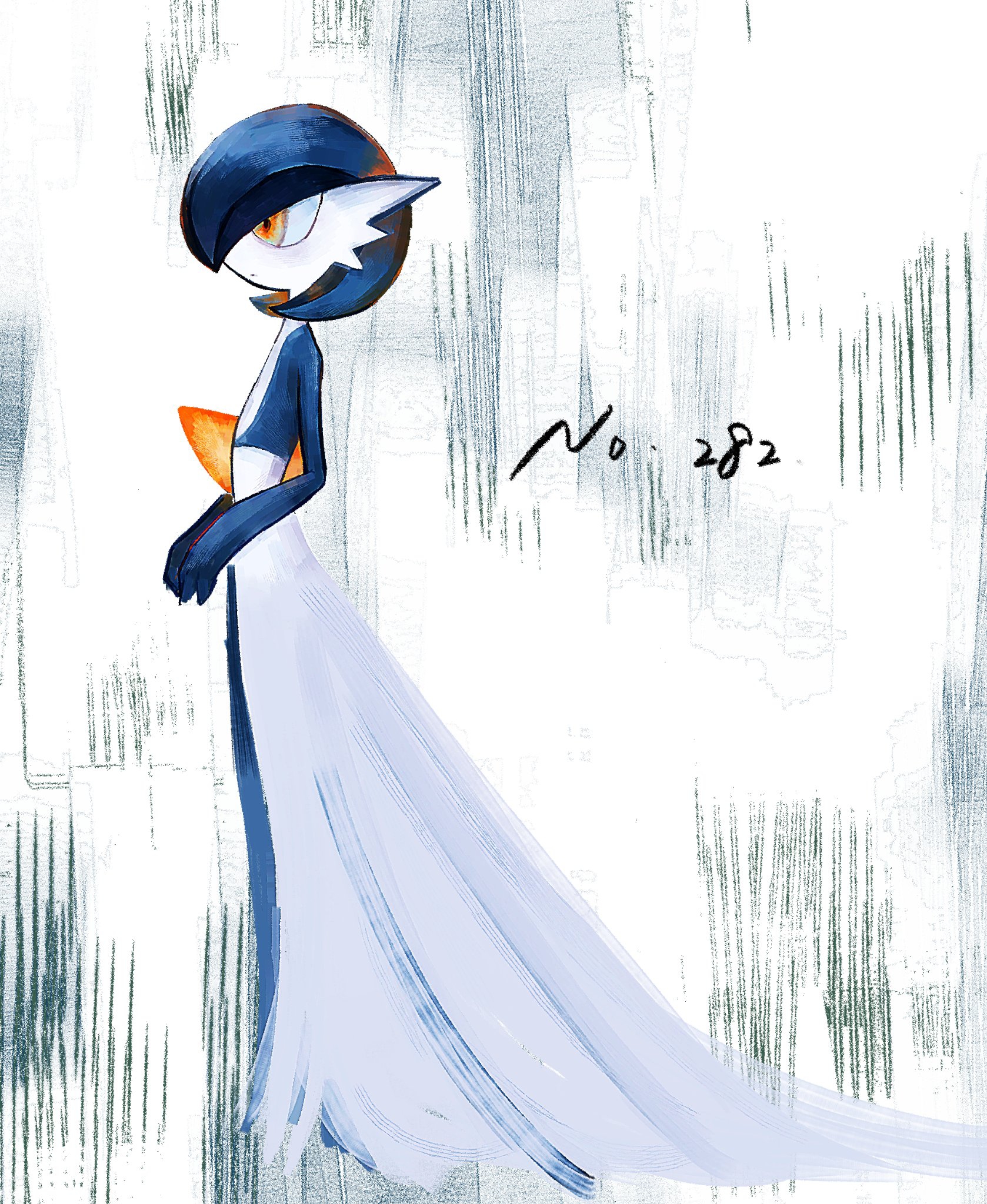 1girl 4shiki alternate_color blue_hair blue_skin bob_cut closed_mouth colored_skin expressionless female_focus flat_chest from_side gardevoir gen_3_pokemon highres multicolored_skin nintendo orange_eyes pokedex_number pokemon pokemon_(creature) profile shiny_pokemon short_hair solo standing two-tone_skin white_background white_skin