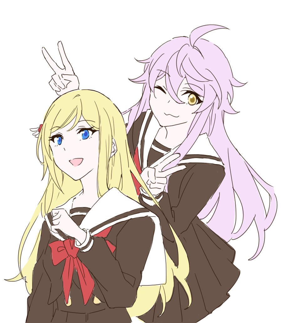 2girls ;3 ahoge arm_at_side arm_up behind_another blonde_hair blue_eyes bow bowtie brown_dress bunny_ears_prank chinese_commentary closed_mouth commentary_request cropped_jacket double_v dress flower hair_between_eyes hair_flower hair_ornament hand_up long_hair long_sleeves looking_ahead looking_at_viewer multiple_girls one_eye_closed open_mouth otonashi_ichie pleated_dress purple_hair red_bow red_bowtie red_flower rinmeikan_girls_school_uniform rowan_(kanonsecret) sailor_collar school_uniform serafuku shoujo_kageki_revue_starlight shoujo_kageki_revue_starlight_-re_live- simple_background standing v white_background white_sailor_collar yellow_eyes yumeoji_fumi