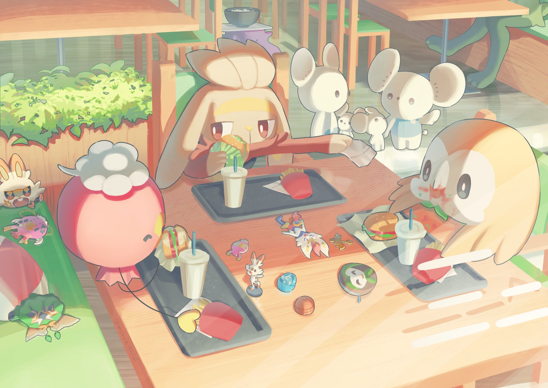 bowl bright_pupils burger chair cinderace commentary_request cup dartrix decidueye disposable_cup ditto drifblim drifloon eating food food_on_face food_wrapper french_fries gen_1_pokemon gen_4_pokemon gen_7_pokemon gen_8_pokemon highres maushold maushold_(family_of_four) mokukitusui nintendo pokemon raboot rowlet scorbunny table themed_object tray white_pupils