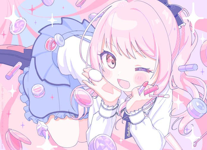 1other akiyama_mizuki black_footwear blue_skirt blush_stickers bottle bow cosmetics eyelashes lipstick lipstick_tube long_hair looking_at_viewer makeup makeup_brush open_mouth perfume_bottle pink_eyes pink_hair project_sekai shirt skirt sparkle uxu_uxa_axa white_shirt