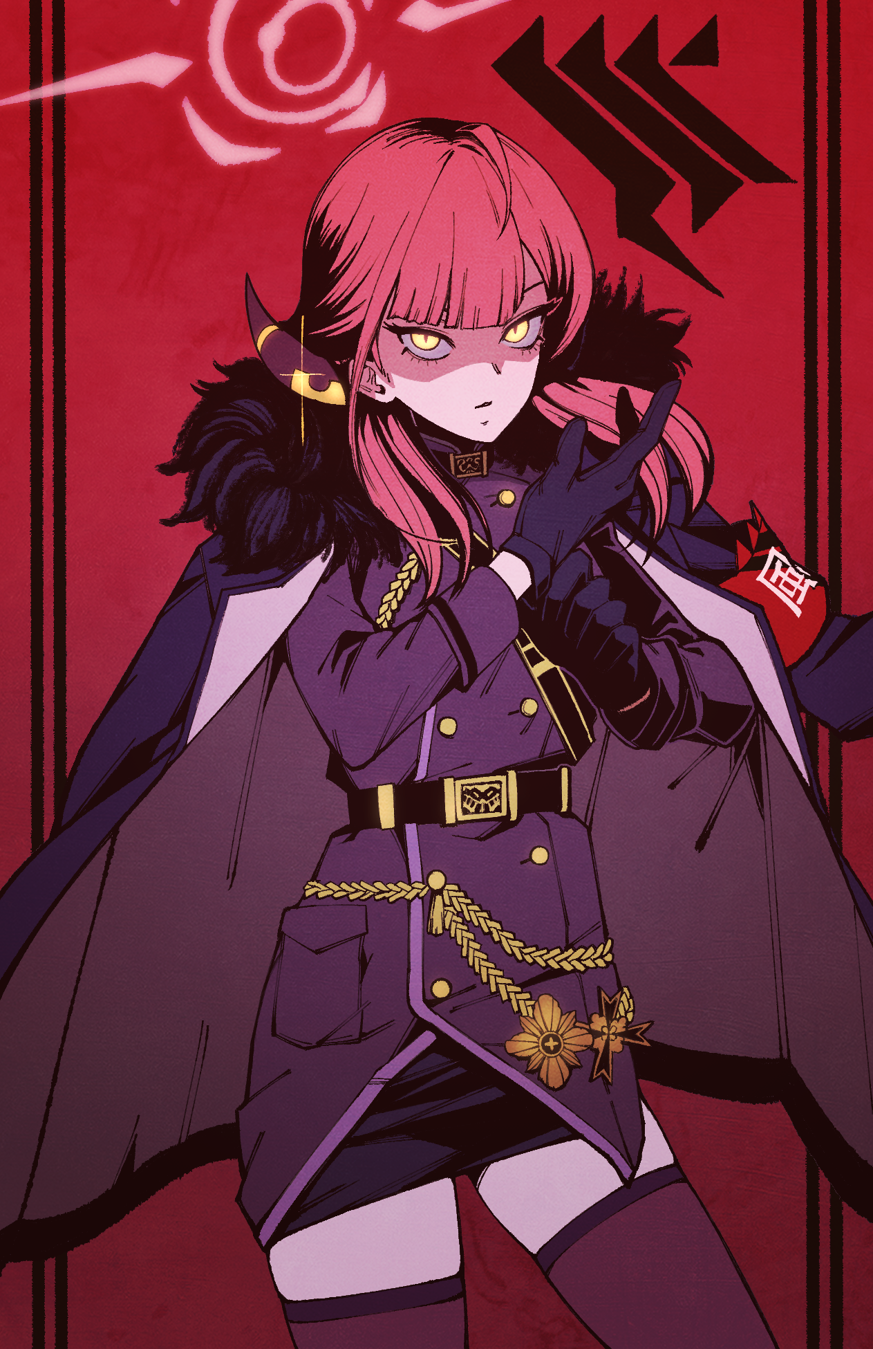 1girl adjusting_clothes adjusting_gloves alternate_costume armband aru_(blue_archive) belt black_coat black_gloves black_skirt black_thighhighs blue_archive blunt_bangs coat coat_on_shoulders commentary_request cosplay cs_(connectedskyy) demon_girl demon_horns fur-trimmed_coat fur_trim gloves halo highres hina_(blue_archive) hina_(blue_archive)_(cosplay) horns long_hair long_sleeves looking_at_viewer military_uniform open_clothes open_coat pencil_skirt red_armband red_background red_hair sam_browne_belt side_slit sidelocks simple_background skirt solo thighhighs yellow_eyes zettai_ryouiki