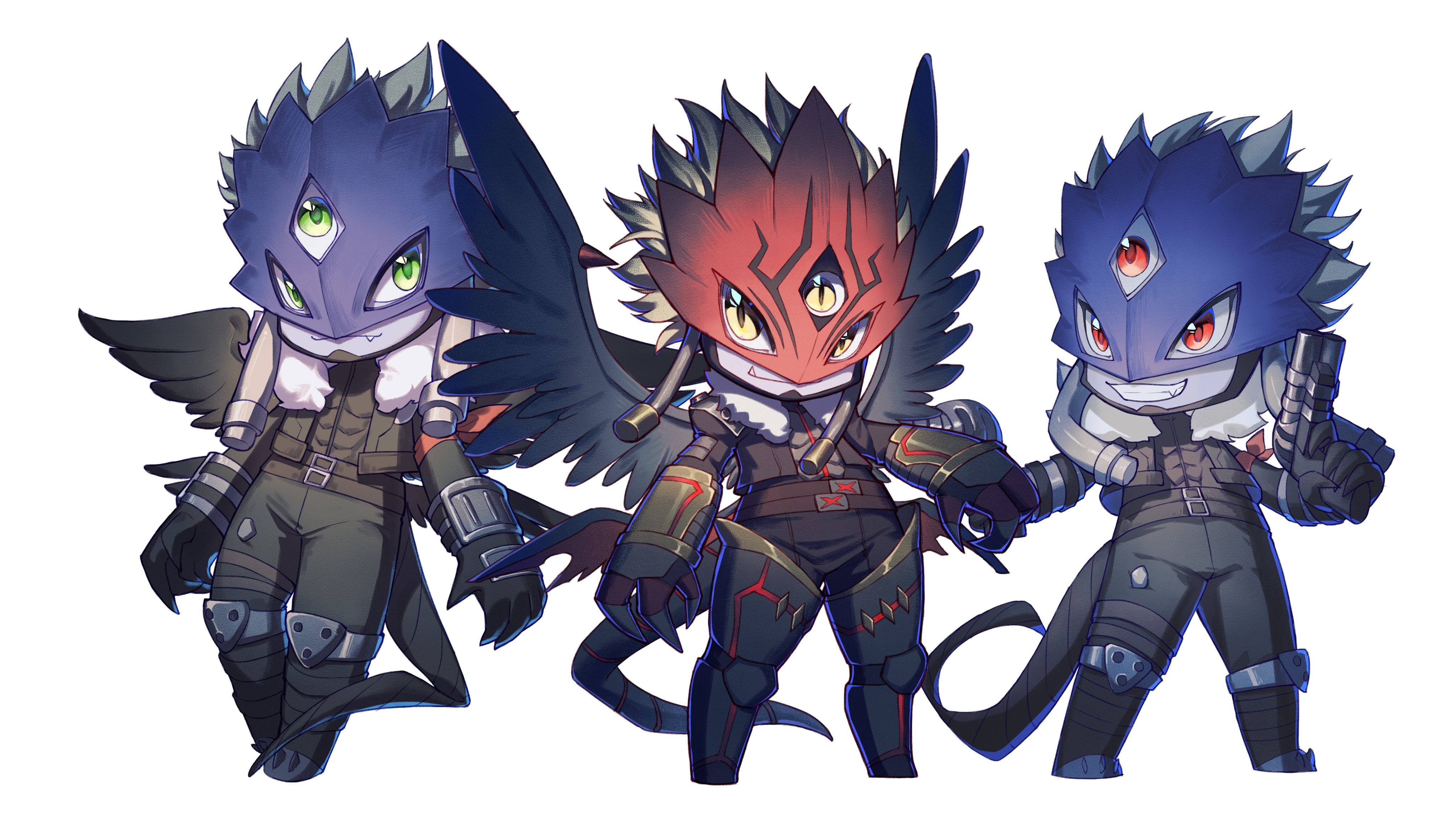 3boys absurdres beelzebumon beelzebumon_blast_mode beelzebumon_x-antibody digimon digimon_(creature) green_eyes gun highres multiple_boys red_eyes smile weapon wings yellow_eyes