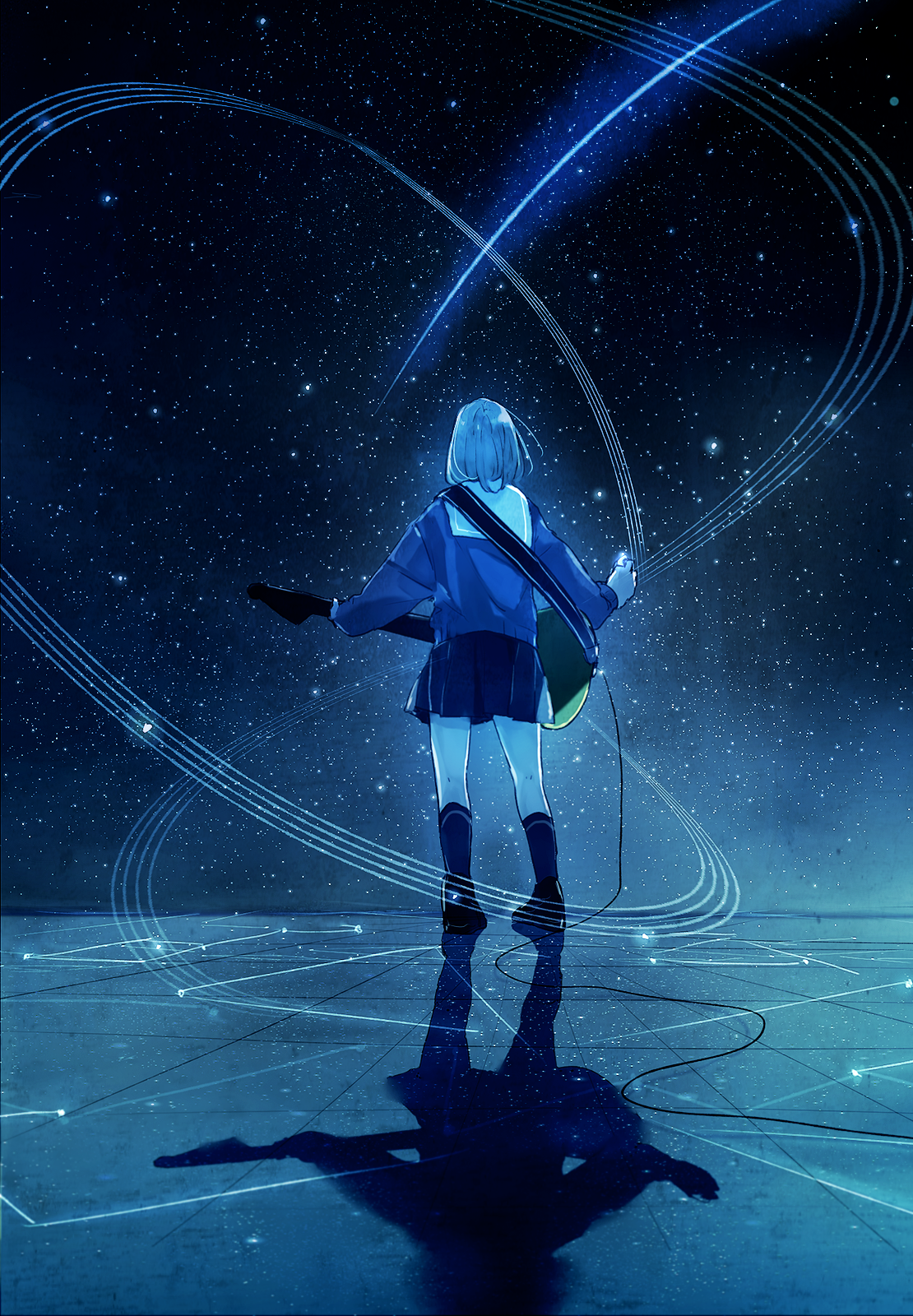 1girl blue_hair blue_skirt blue_socks blue_sweater blue_theme commentary from_behind guitar highres instrument long_sleeves original sailor_collar school_uniform serafuku shadow short_hair skirt sky socks solo standing star_(sky) starry_sky sweater white_sailor_collar yuribou